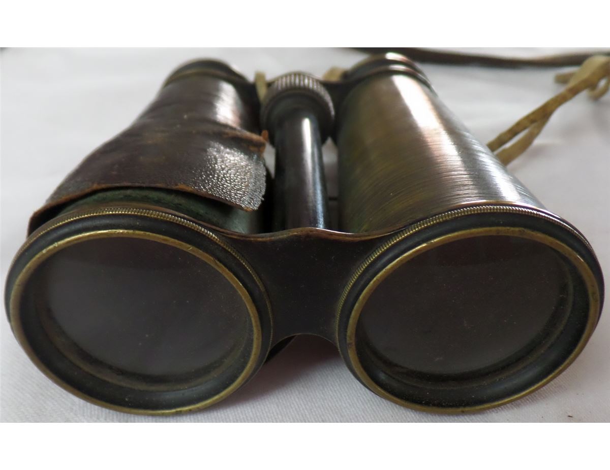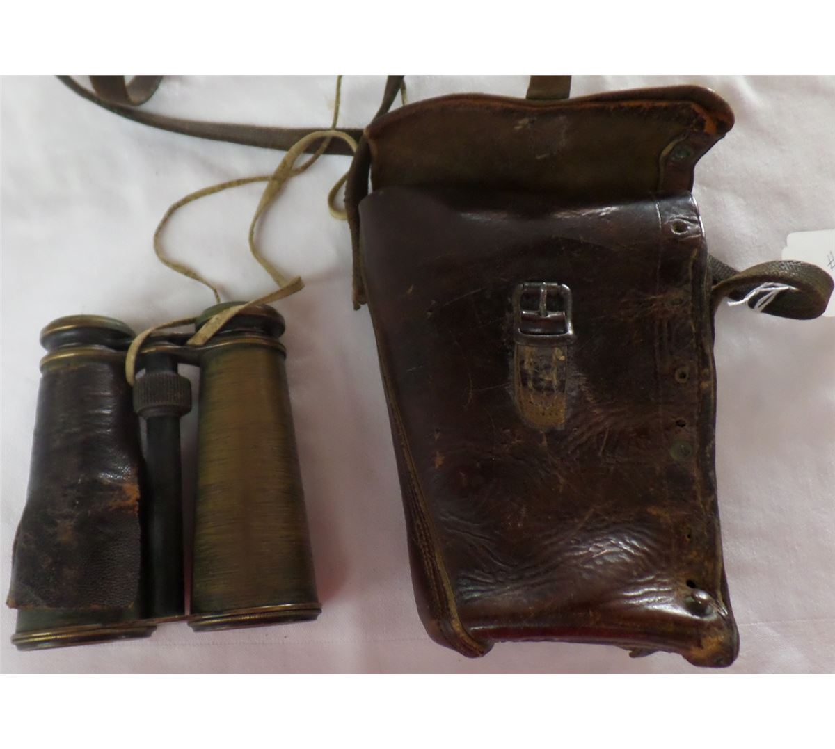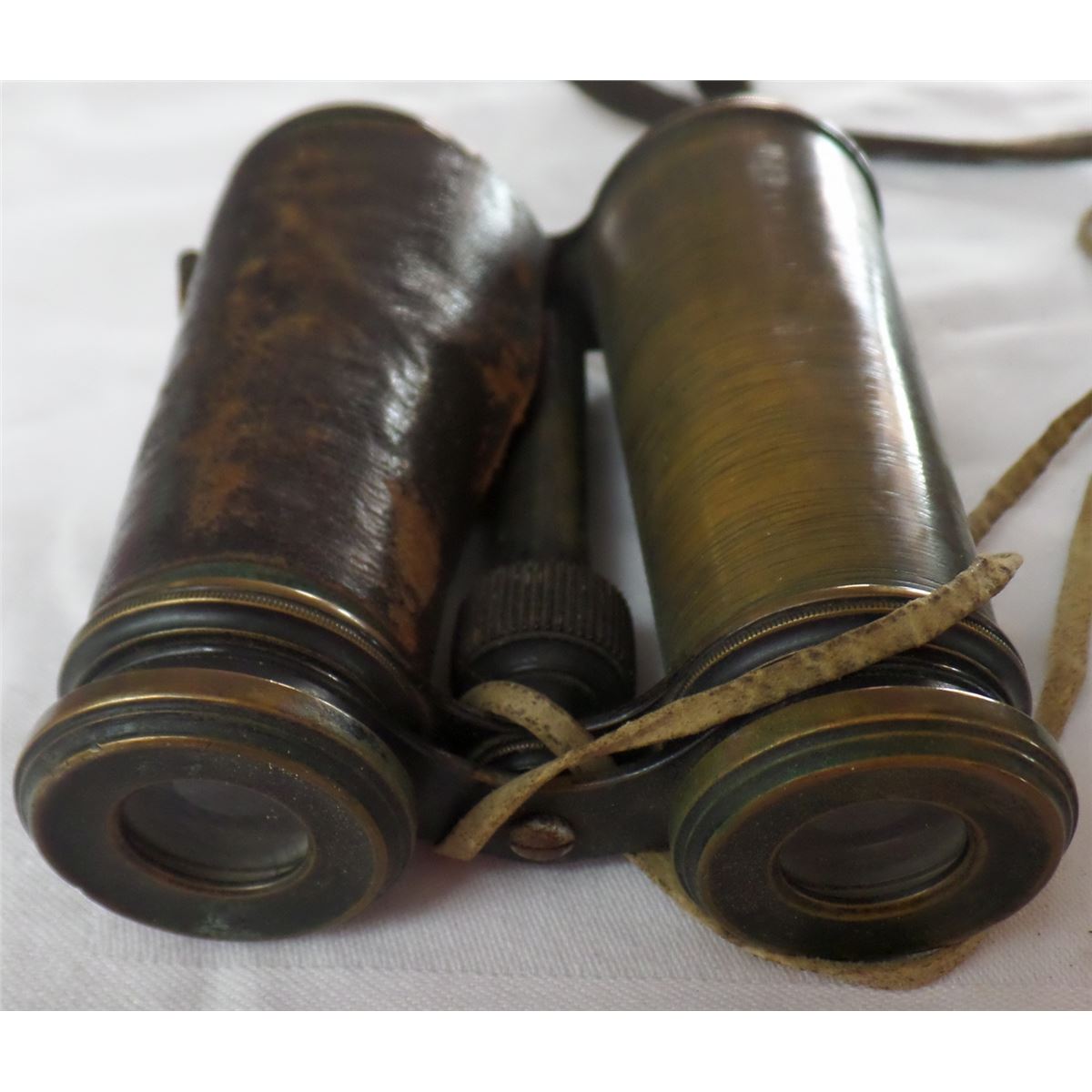 Antique Binoculars, possibly Civil War. One of the binocular eye piece tube has leather missing, the other has damaged leather covering. The Binoculars are in a custom made case made from a salvaged riding boot. The Binoculars measure approximately 5 x 4 inches and the case is 7 x 6 inches without the strap. This item is purportedly according to consigner from the Confederate side of the Civil War. They may have been from Spotsylvania, Virginia. The item is from a San Diego Physician's estate. Worn and Used condition. Shipping $18.50