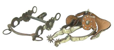 Circa Early/Mid 1900s, Finer pair of "Gal-leg" spurs with engraved German silver overlays plus a similar style bit. Very good condition. 9-1/2" x 4" spurs, 6" x 5" bit