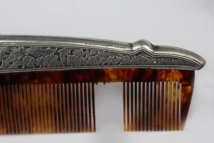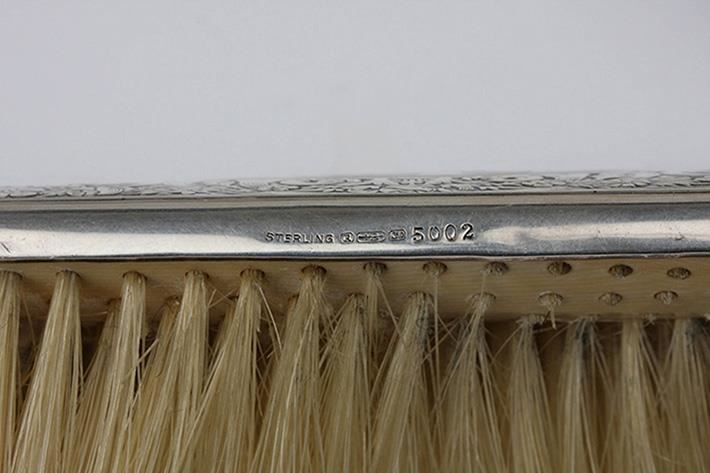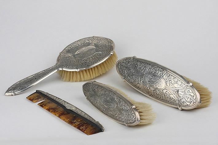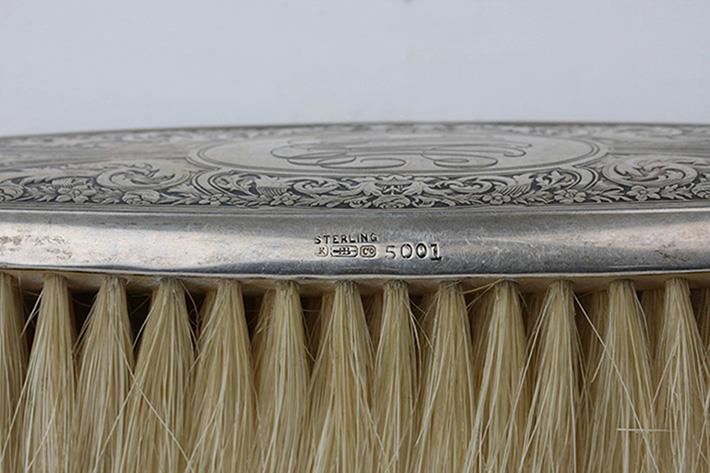 Four piece antique Blackington sterling silver vanity set. Art nouveau. Set by Blackington #5027. Beautifully monogrammed set consists of: one handled brush, two coat brushes and one comb.