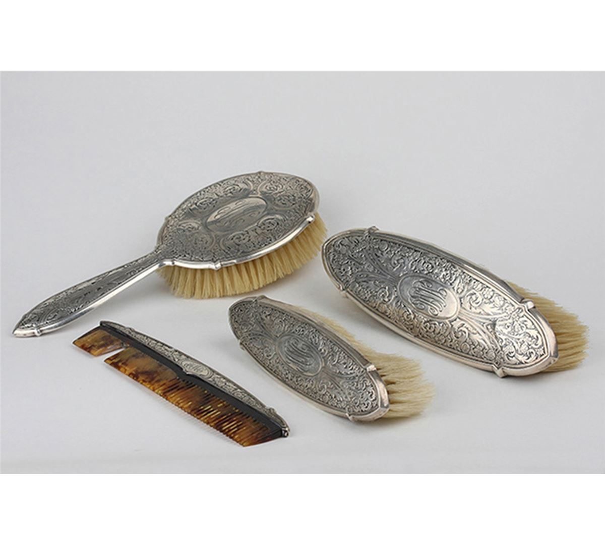 Four piece antique Blackington sterling silver vanity set. Art nouveau. Set by Blackington #5027. Beautifully monogrammed set consists of: one handled brush, two coat brushes and one comb.