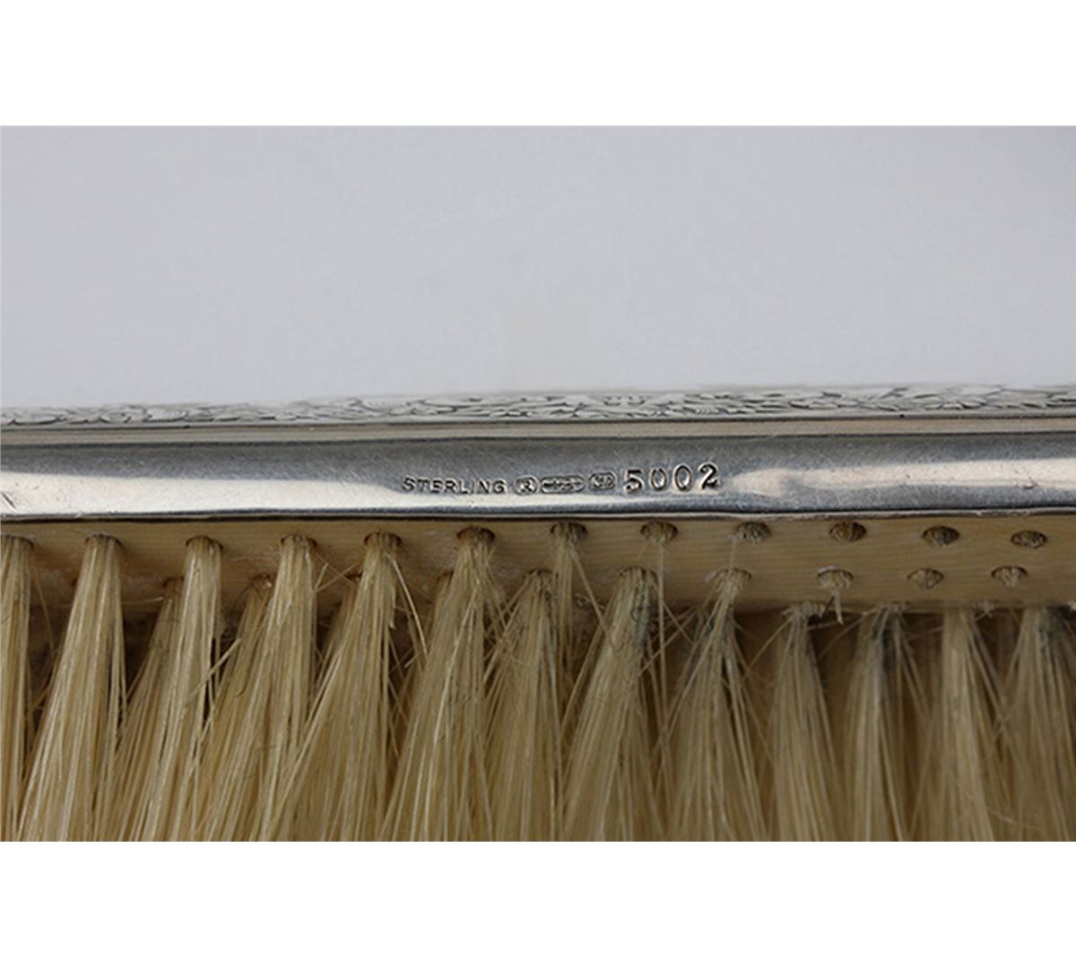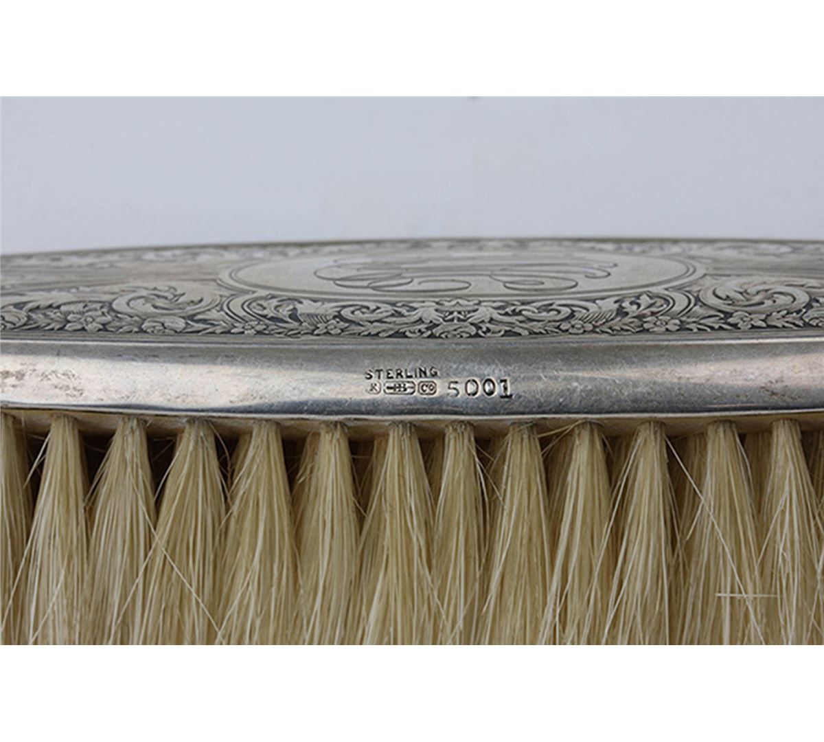 Four piece antique Blackington sterling silver vanity set. Art nouveau. Set by Blackington #5027. Beautifully monogrammed set consists of: one handled brush, two coat brushes and one comb.