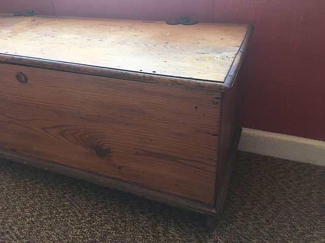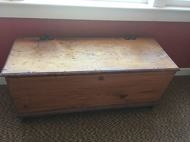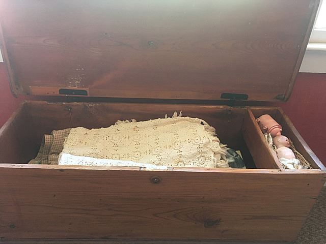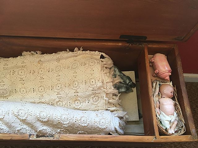 Antique 6 board blanket chest and contents including dolls, vintage bedspread, etc.