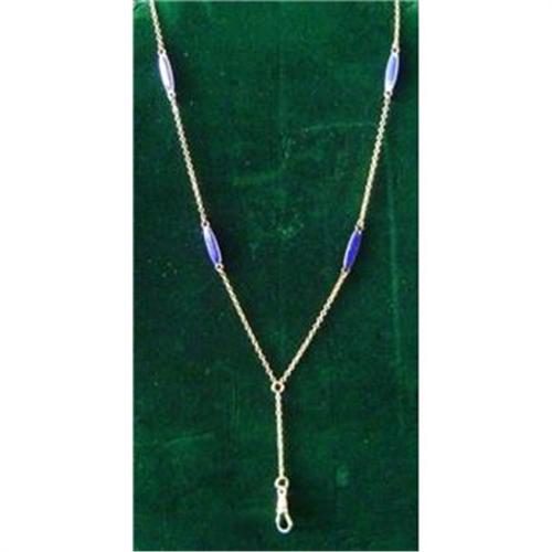 4 dark royual blue enamel stations. Chain is 21.5 inches long, and .30 inches wide at the enamel. Has one inch extention to hang pendant. 1.9 dwt. 3.0 gr. In excellent original condition.