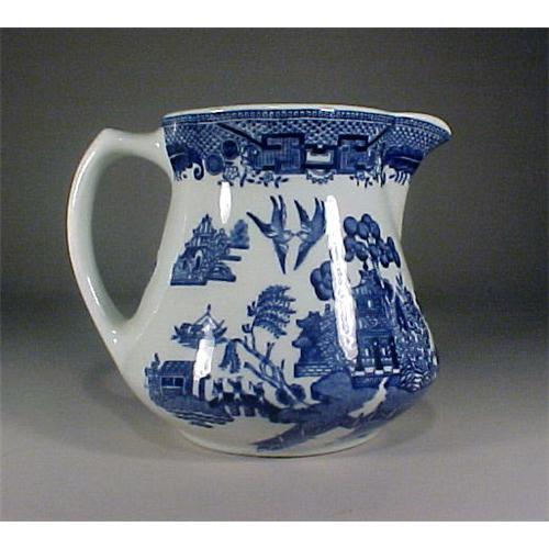 Blue Willow Picher marked on the bottom - Shenango China, Newcastle PA - approx circa 1950?s. Here is a wonderful heavy stone ware pitcher in the blue willow design. It is in a rich and exciting blue and as you can see all of the blue willow work is very well defined. It is a nice short heavy weight pitcher probably for gravy or cream or something like that. It is in absolutely perfect condition. The overall diameter including the spout and handle measures 6 3/8? and it is 5 ¼?h.