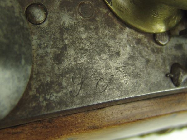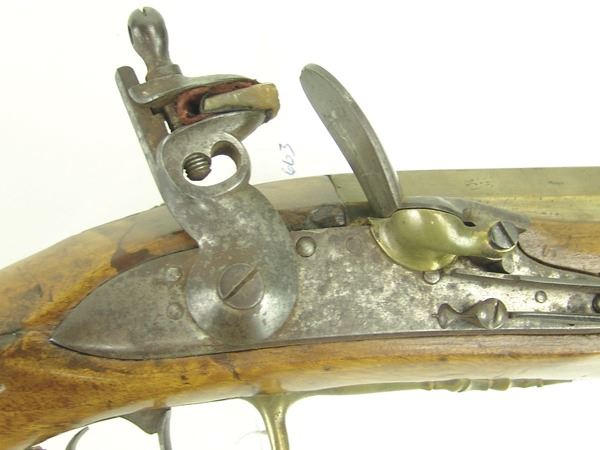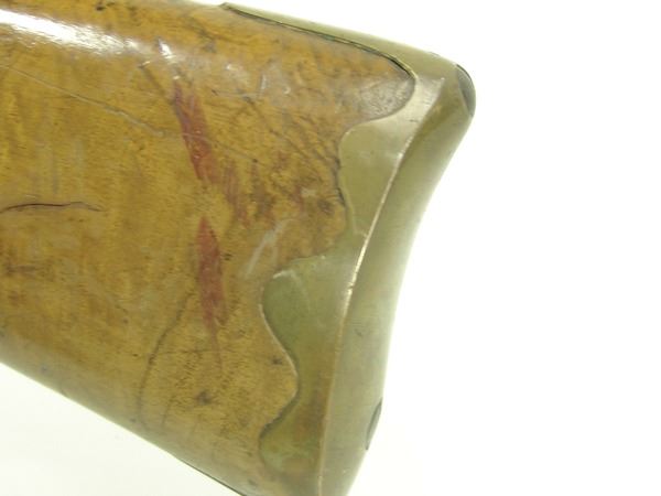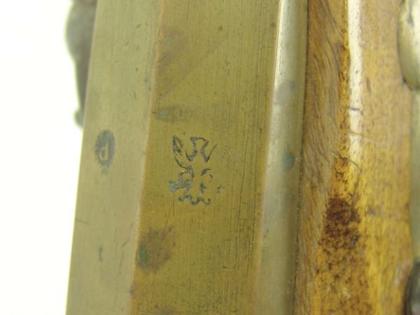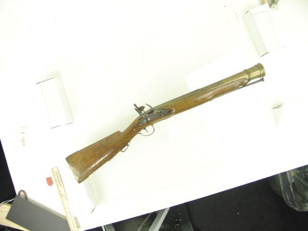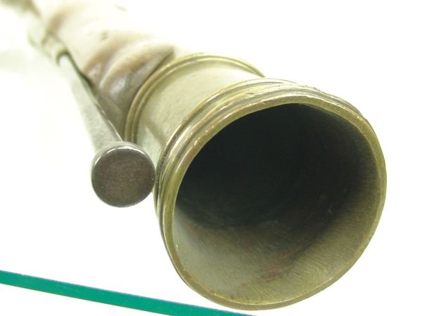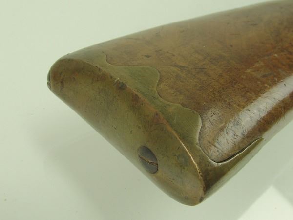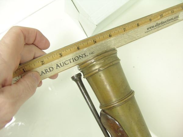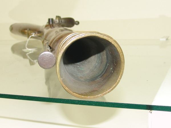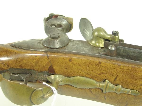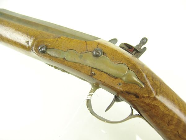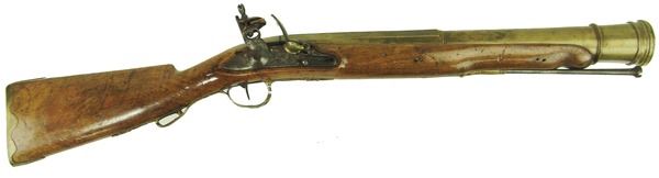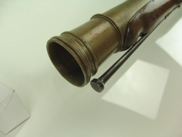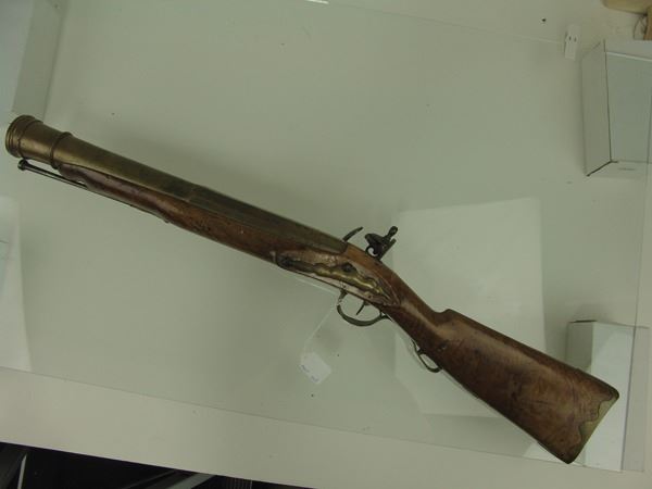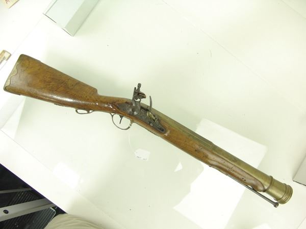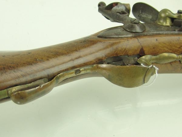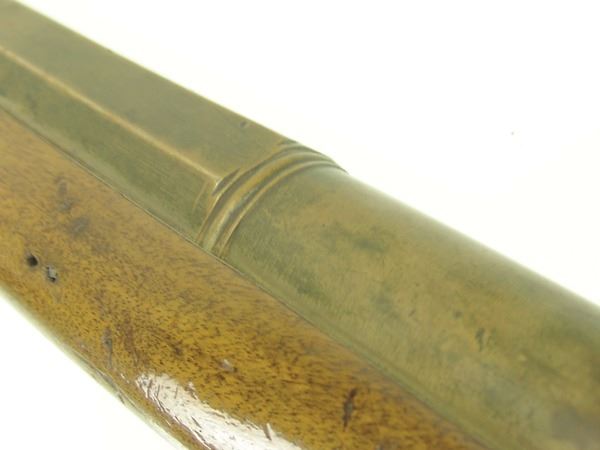 Late 1700s 34" Good quality, mid 18th century brass barreled flintlock blunderbuss with burled stock and brass butt plate. Possibly by Barber of London. Good condition. Well used.