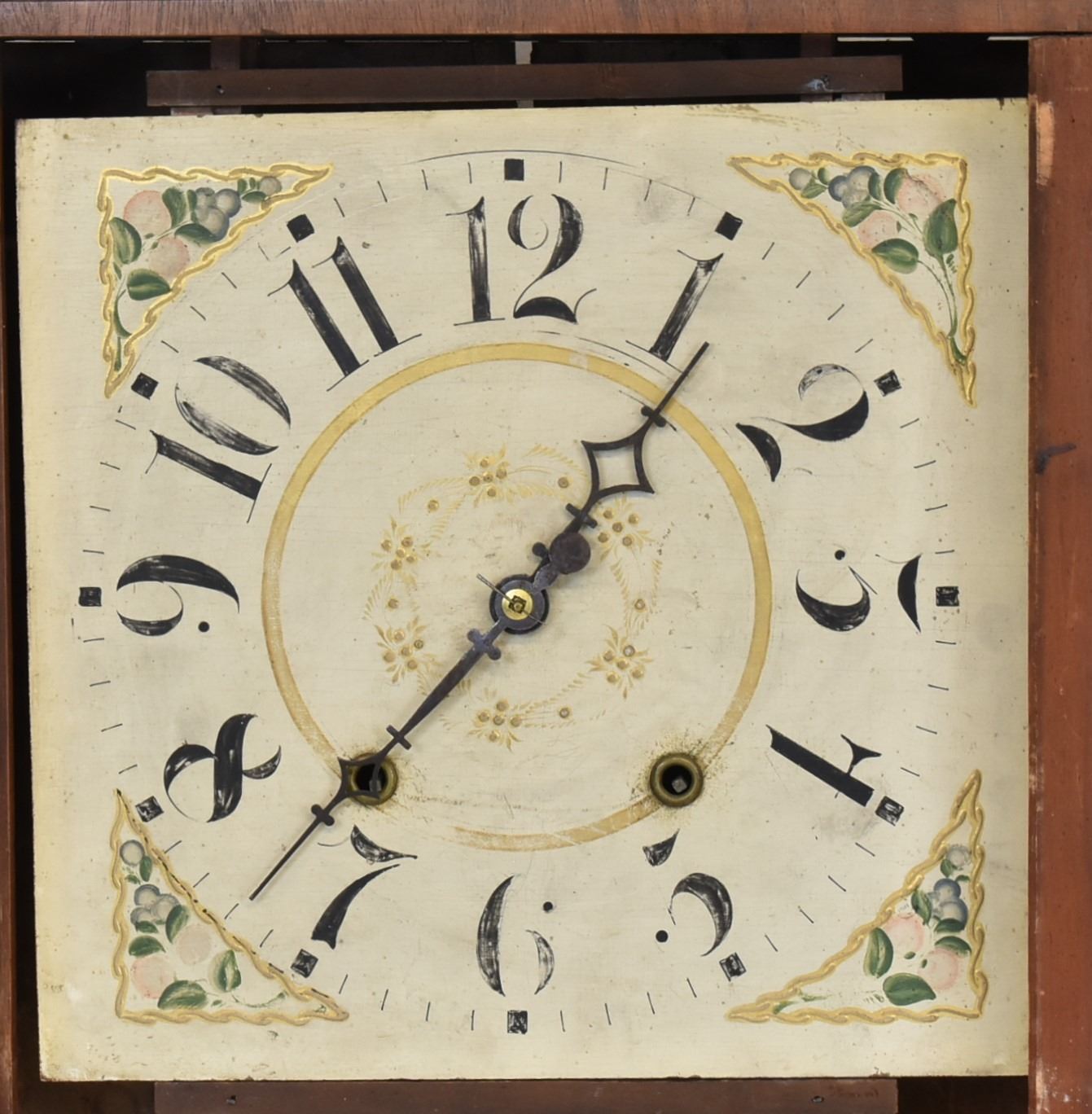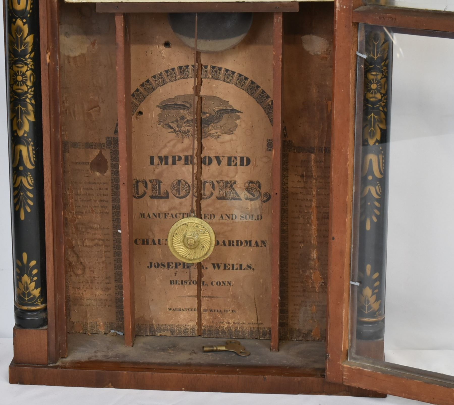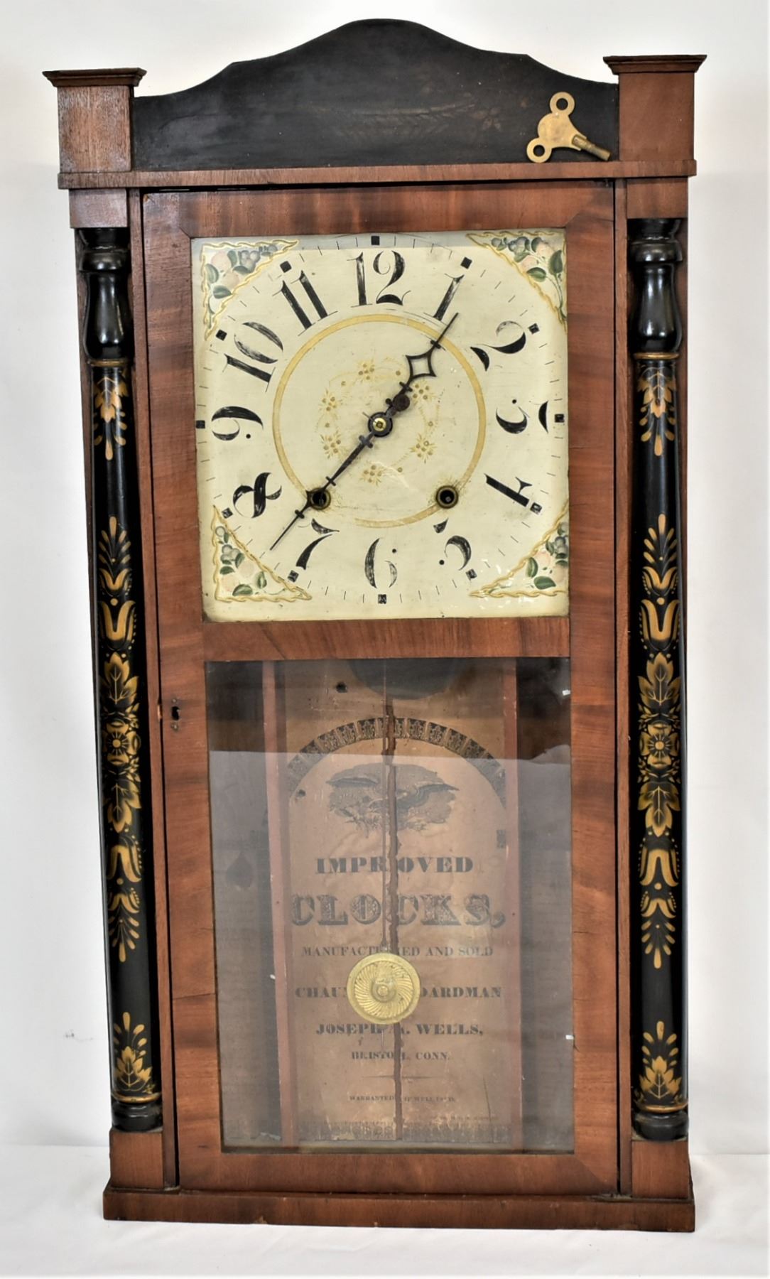 Antique Boardman & Wells Wooden Works Empire Mahogany Mantel Clock, ca. 1832-1844, stenciled split columns, painted black with gold trim and floral designs, maker's label on inside backboard ''Improved Clocks Manufactured and sold by Chauncey Boardman and Joseph Wells, Bristol, Conn., Warranted If Well Used'', measures approximately 32.5'' x 15.24'' x 5.5'', original painted wood dial with winding arbors at 7 and 9, no weights, original bob, FYI: Chauncey Boardman was born in 1789 and worked in Bristol, CT from 1810-1850. In 1832 he formed a partnership with Joseph Wells and they operated 4 different factories and produced wood movements until 1837 and the introduction of rolled brass. The firm dissolved in 1844 and each continued under their own name.