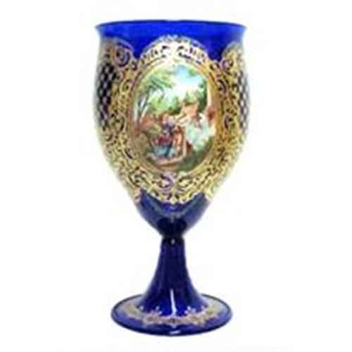 Here is a fantastic, large and impressive Bohemian compote in cobalt blue. It appears to be free blown with a lavish amount of gold gilt and fine enameling that compliment the three large oval hand painted scenes perfectly. The more I look at this compote the more I think it?s a wedding chalice. One of the scenes, as I interpret it, is the chance meeting of a couple. The next scene appears to be the marriage and joy of the couple and the third scene appears to be the woman sitting pensively with her two small children in the same garden where they first met gazing towards the sky. This must be all about the life of women. This big beauty measures 12 7/8? high with a top opening of 6? in diameter and the base is 5? in diameter. The piece is in perfect condition. It has the numbers 76 15 on the bottom which appear to be enameled. I?m almost positive that this piece pretty can be attributed to Moser.