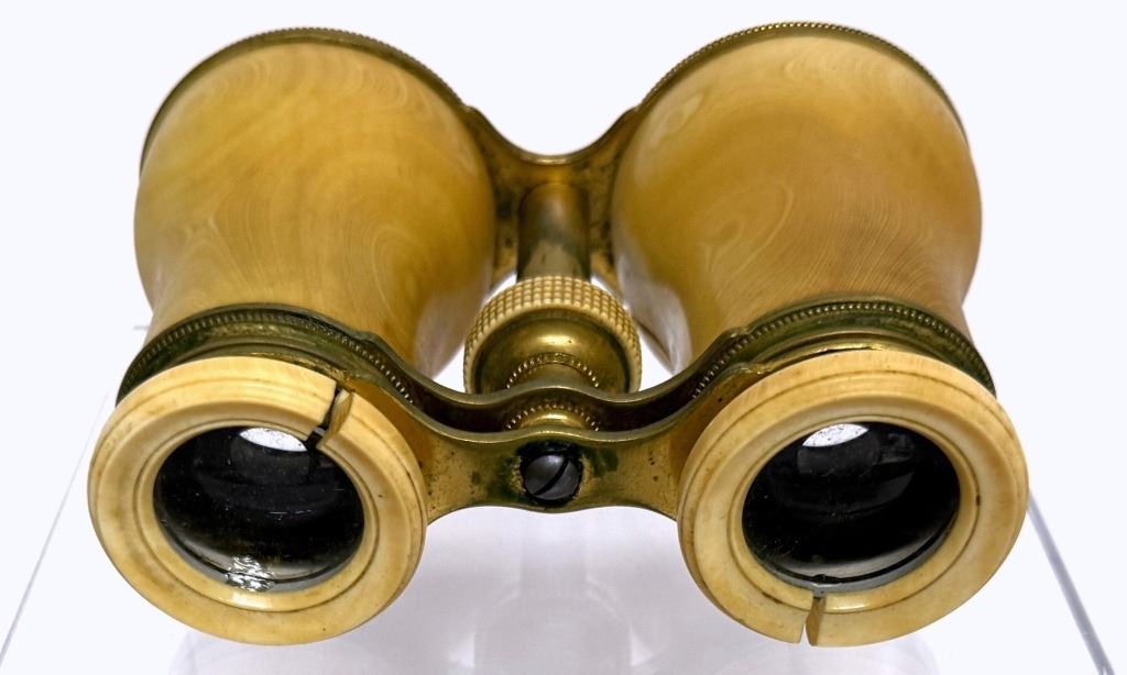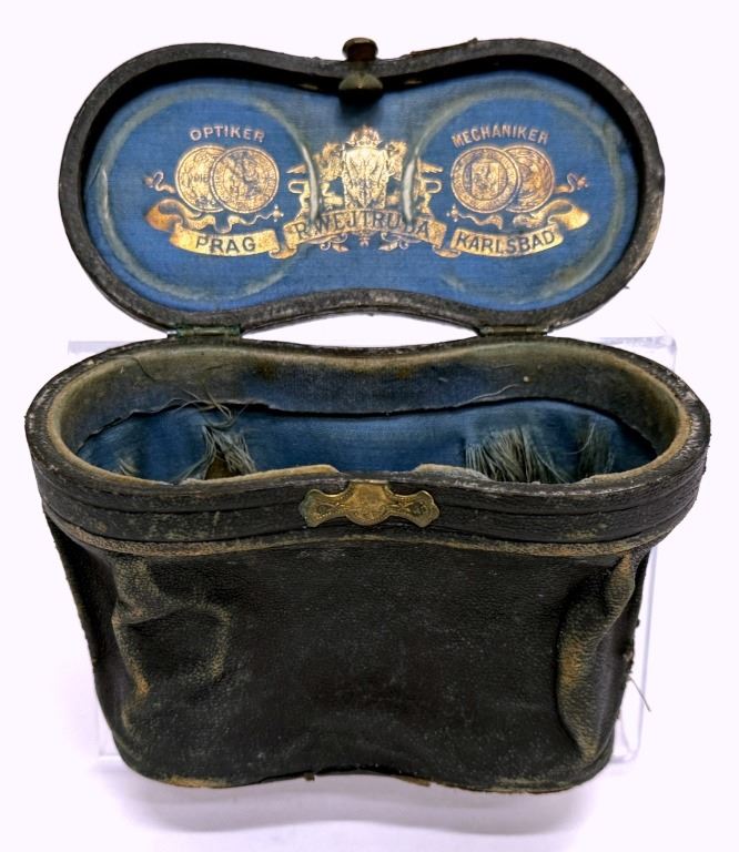 Item/Description: Antique opera glasses, dating from the late 19th to early 20th century, presented in their original fitted black case. The binoculars feature a classic design with polished brass frames and bone material around the barrels. The accompanying black leatherette case bears the stamp: "Optiker Mechaniker Prag R. Wejtruda Karlsbad," identifying the prestigious optician R. Wejtruda, who operated in Prague and Karlsbad in Bohemia during the Austro-Hungarian Empire. (Optical Instruments, Antique Decorative Accessories, Bohemian, Czech)