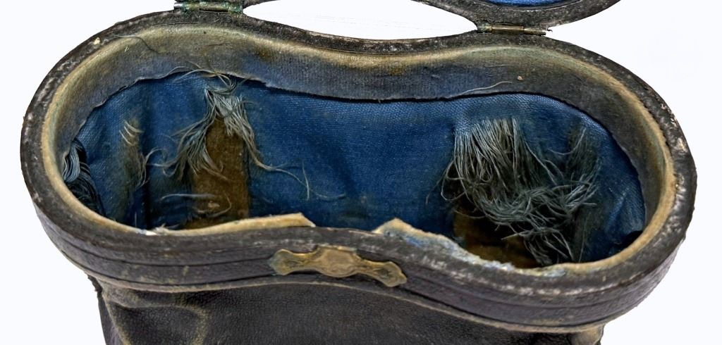 Condition: In working condition; binoculars open and close well. Signs of age, use, and wear include surface marks, residue, missing a piece near the eye, and general wear to the case.