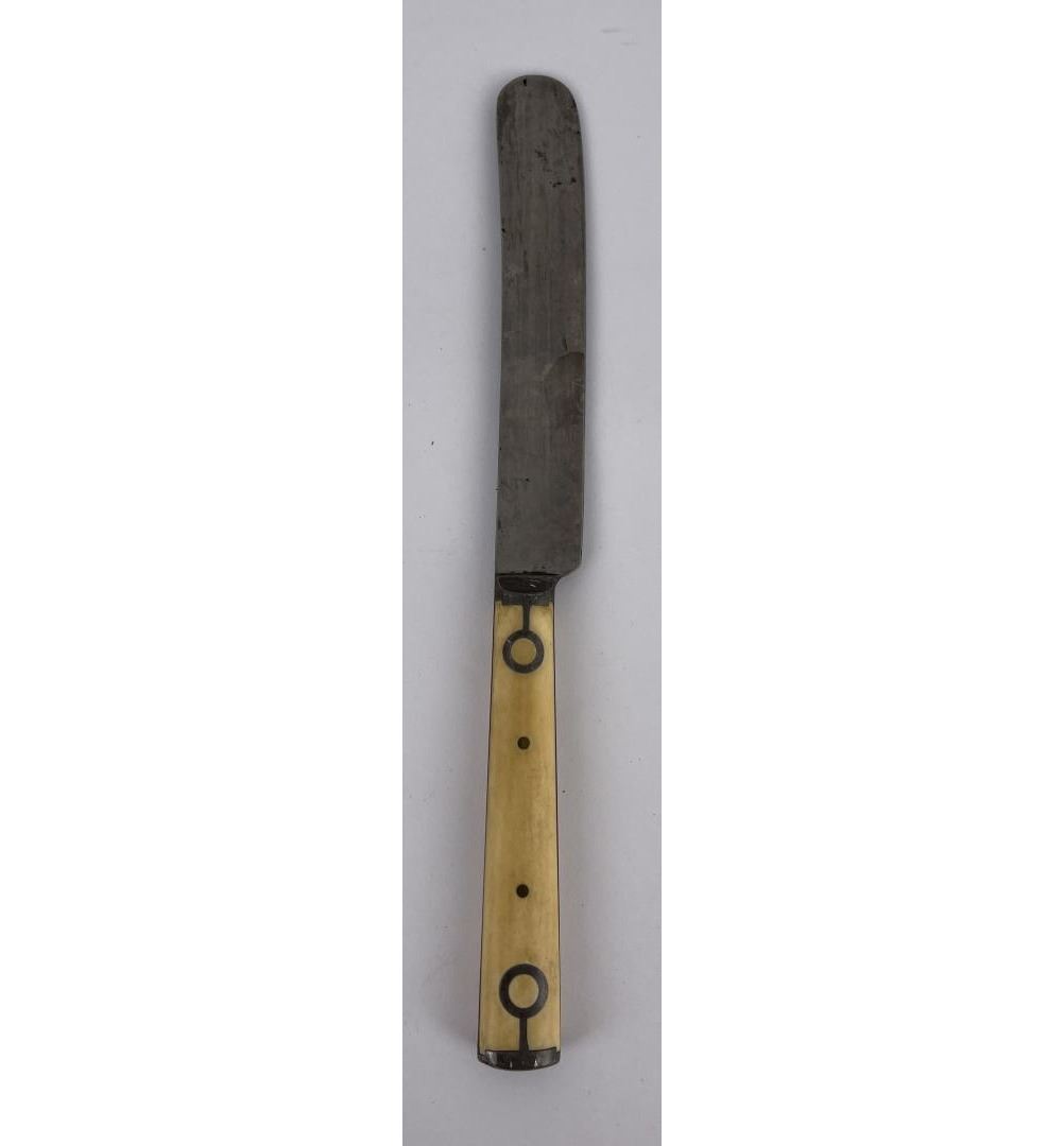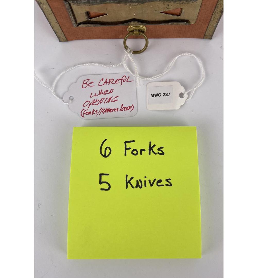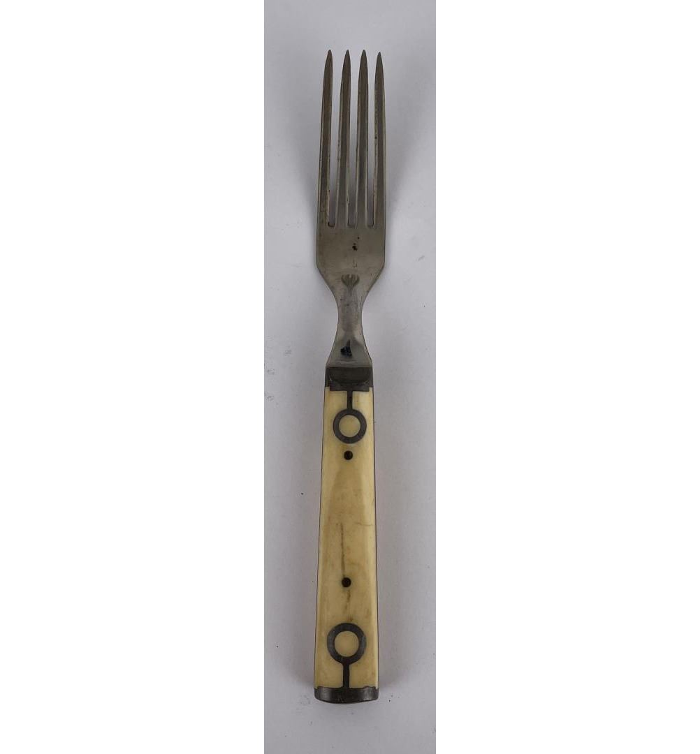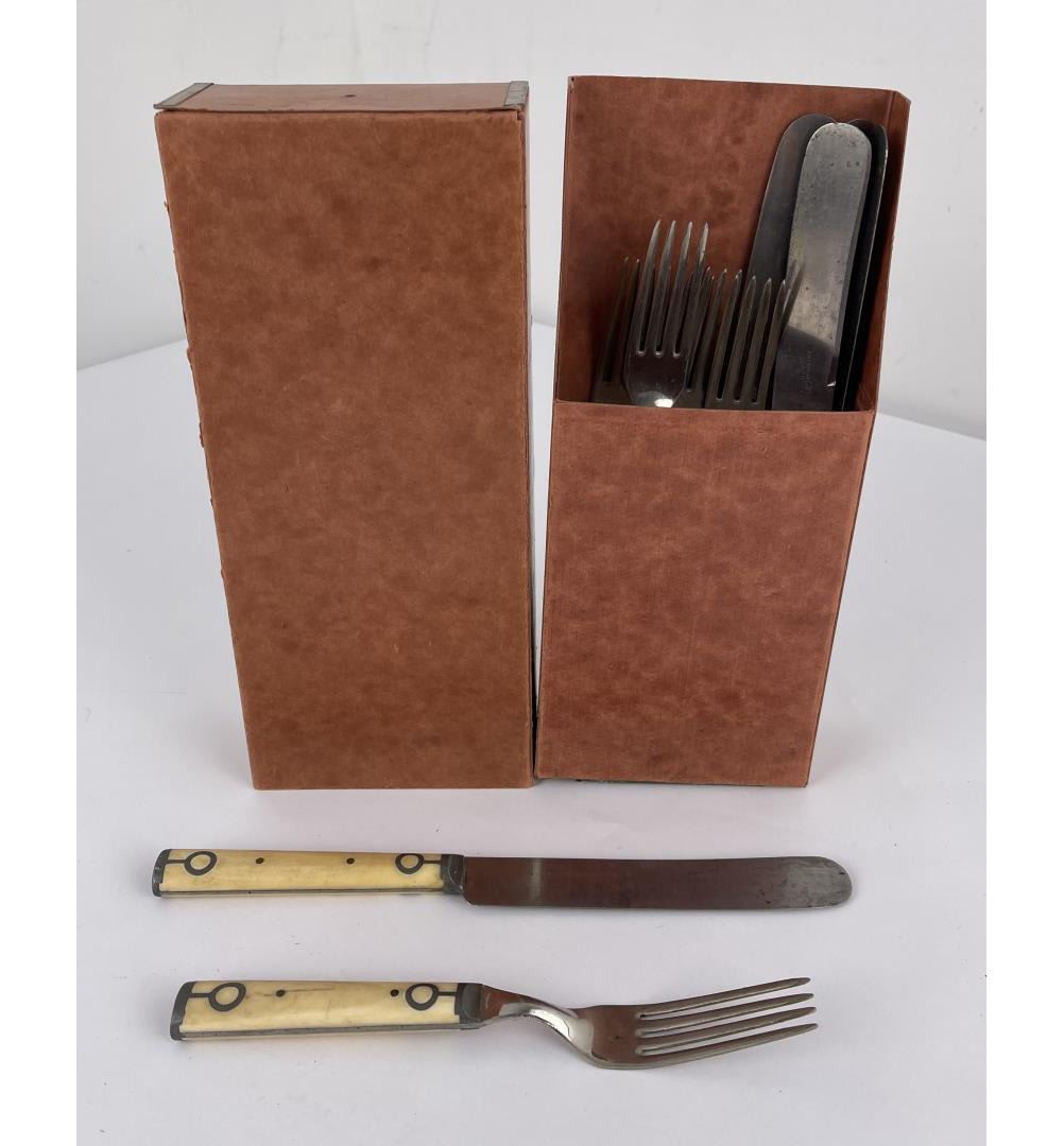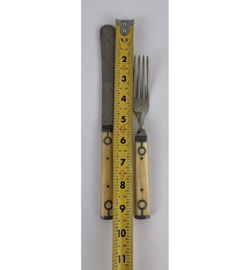 Made by American Cutlery Company. Beautiful bone handles with lead inlay. Five knives, 6 forks, one fork has hairline crack (no missing pieces). The balance has no chips or cracks.
