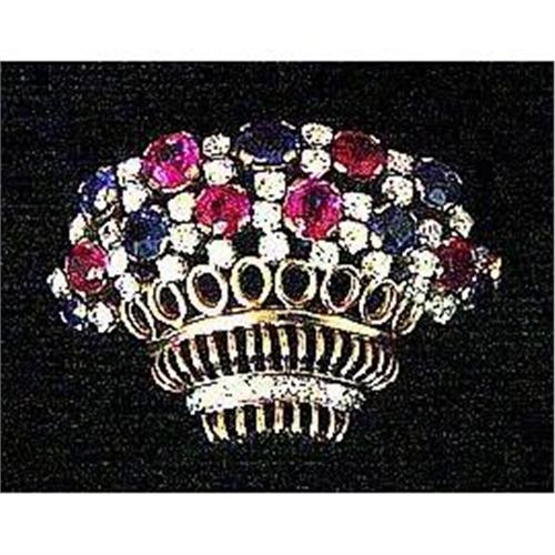 Diamonds, Rubies and Sapphires set in 18K Gold. All diamonds tested with a diamond tester. All rubies and sapphires tested with refractive index liquid. A precious stone interpretation of the flower basket. 18K gold tested with 18K acid.