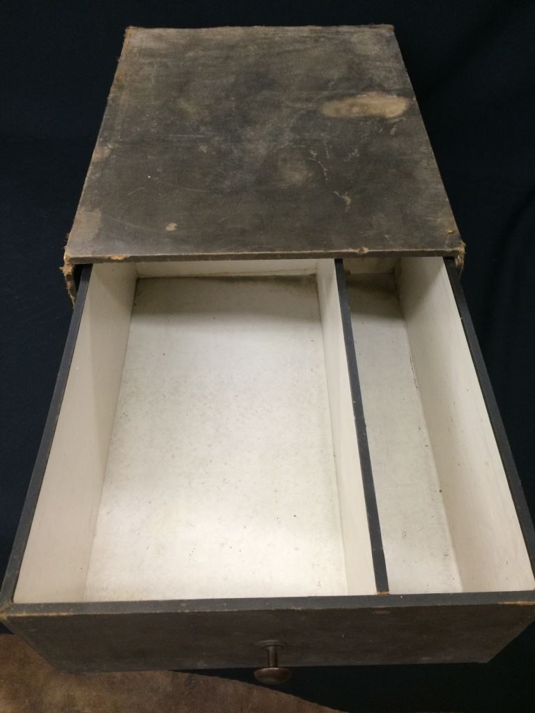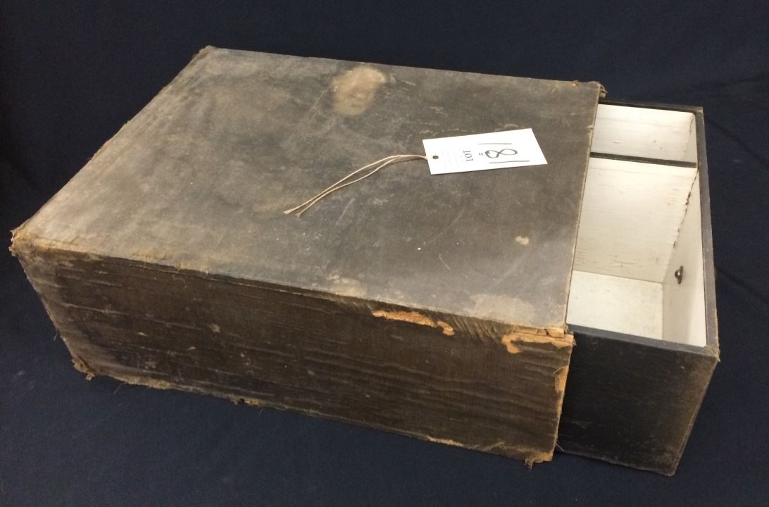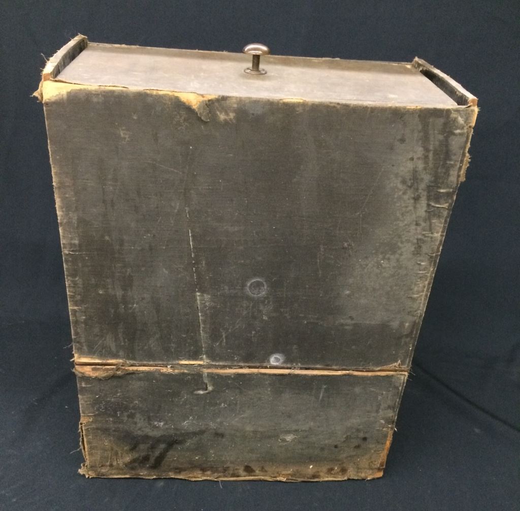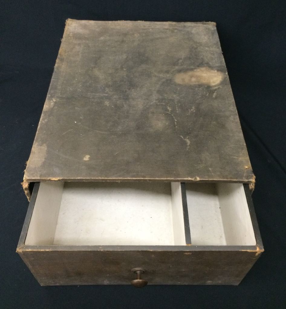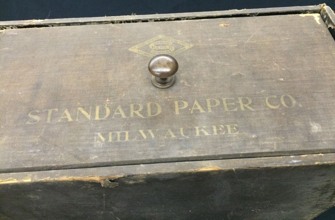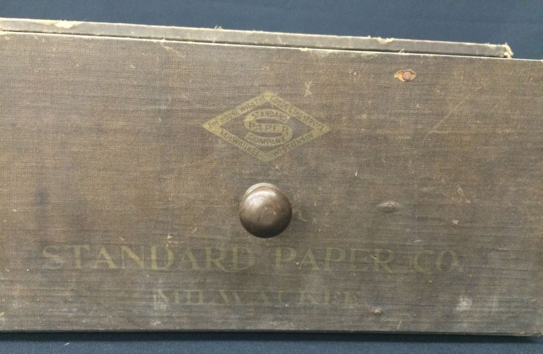 Dated circa 1917, this antique box / drawer with brass pull says “Standard Paper Company” on it. Box came from the old Frontier Relics Museum (Orville Mickens estate). Would make a great display item. Measures 6.5” tall x 13.5” wide and is 17.5” front to back. Rustic condition, please see pics. Shipping: There will be a $7 handling / packaging fee for shipping this lot. The actual cost of postage will be added on top of that.