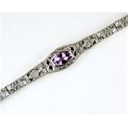This Antique Style Bracelet is an Authentic & Accurate copy of the filigree work made popular in the 1930s. It is a STERLING Silver Bracelet and it feautres a Genuine Amethyst with a Diamond set each side.