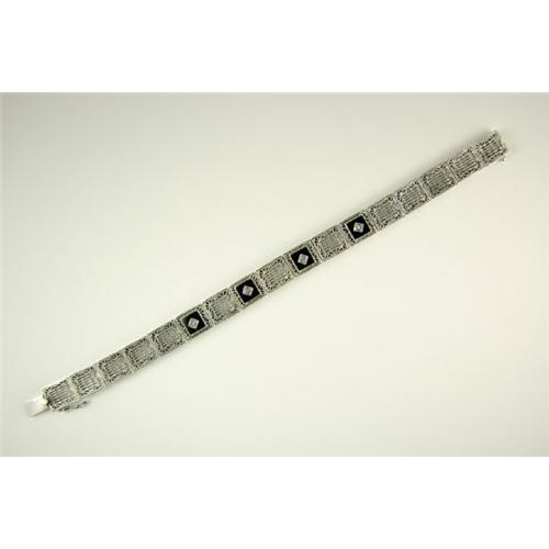 This Antique Style Bracelet is an Authentic and Accurate copy of a Bracelet from the 1930s and THIS one is in MINT condition. The Bracelet is STERLING SILVER and it features exquisite Filigree Links with BLACK ONYX and DIAMONDS. This Bracelet is 7 1/2 inches in length and it is 3/8 inch Wide.