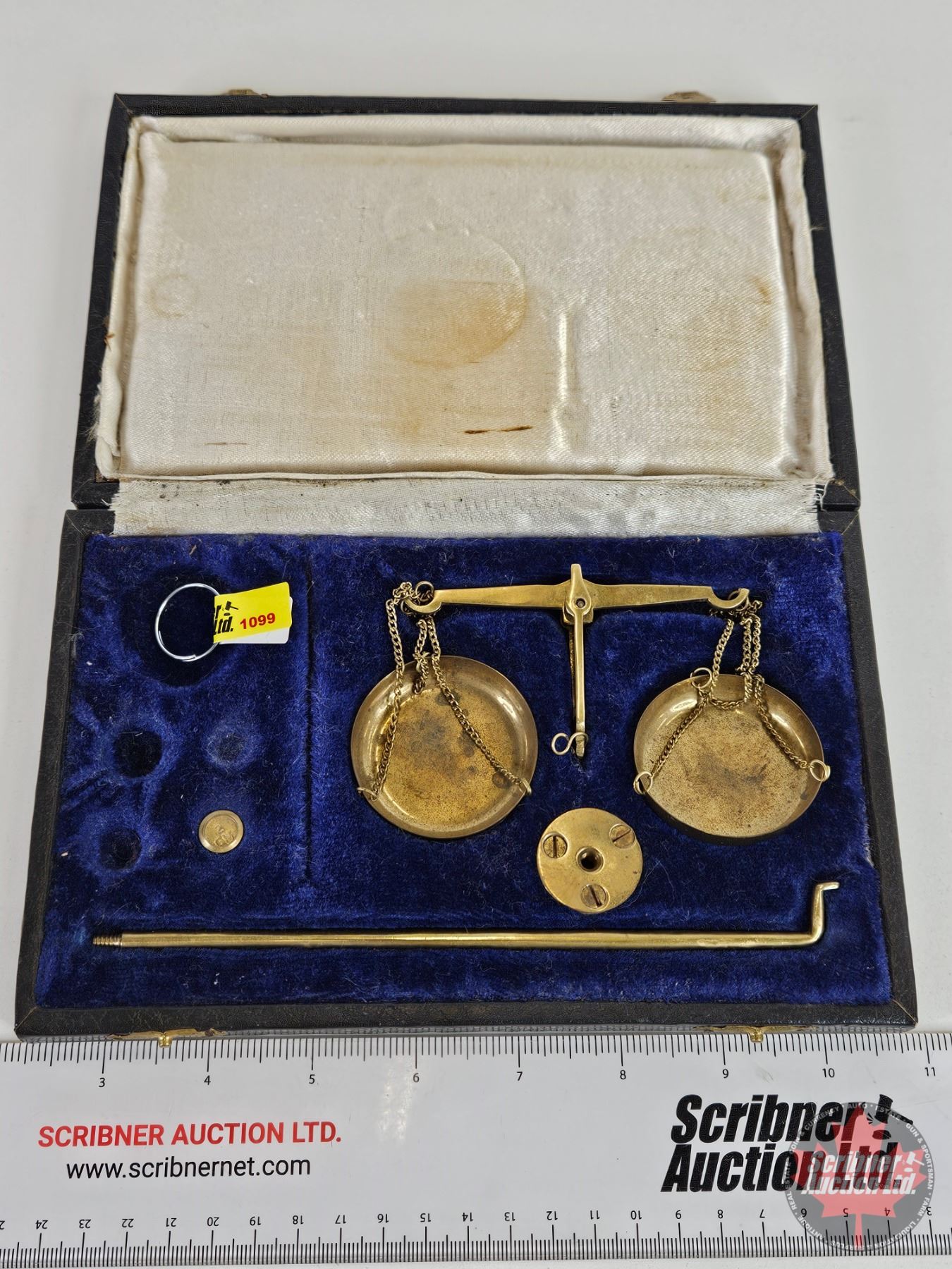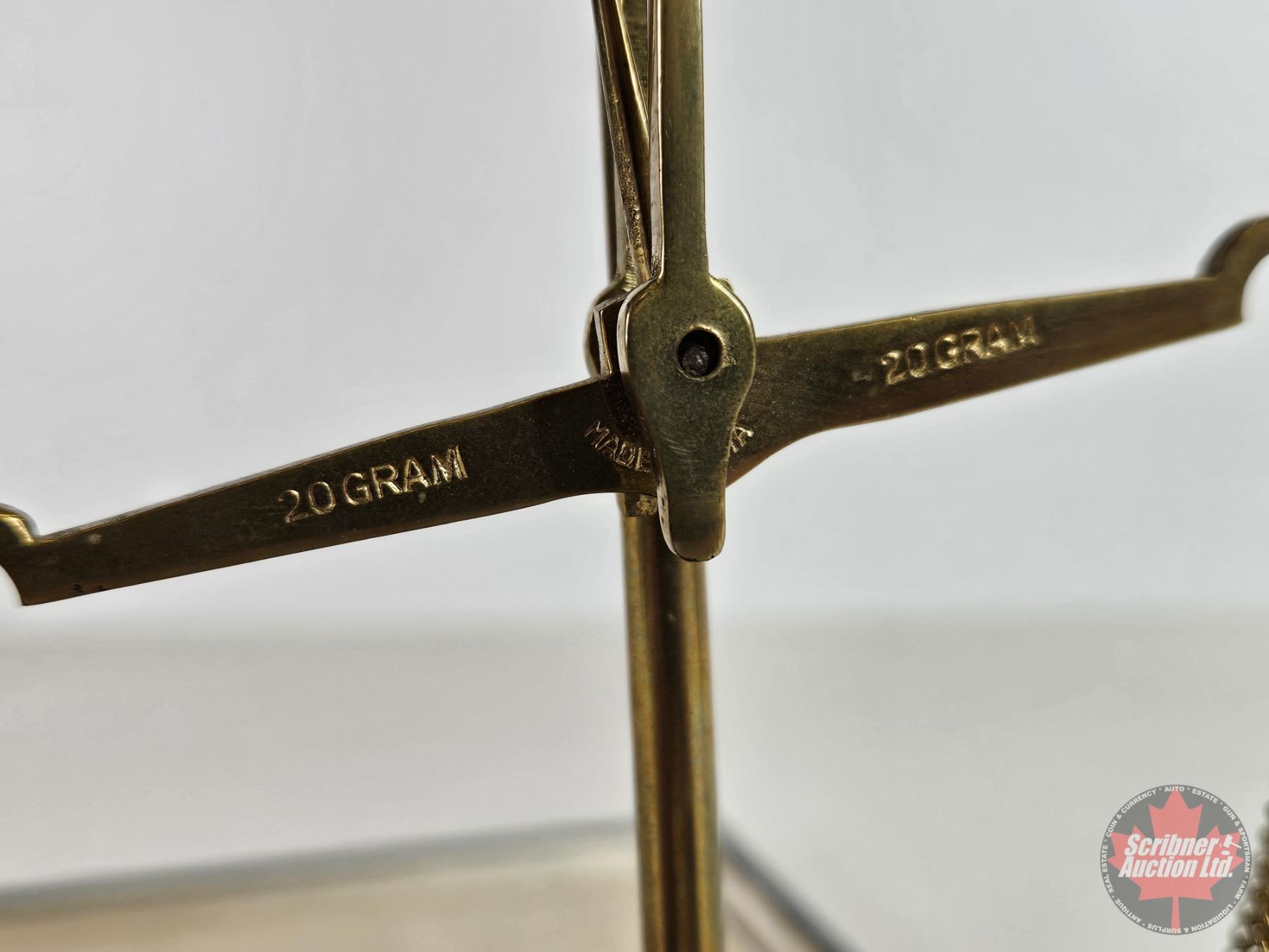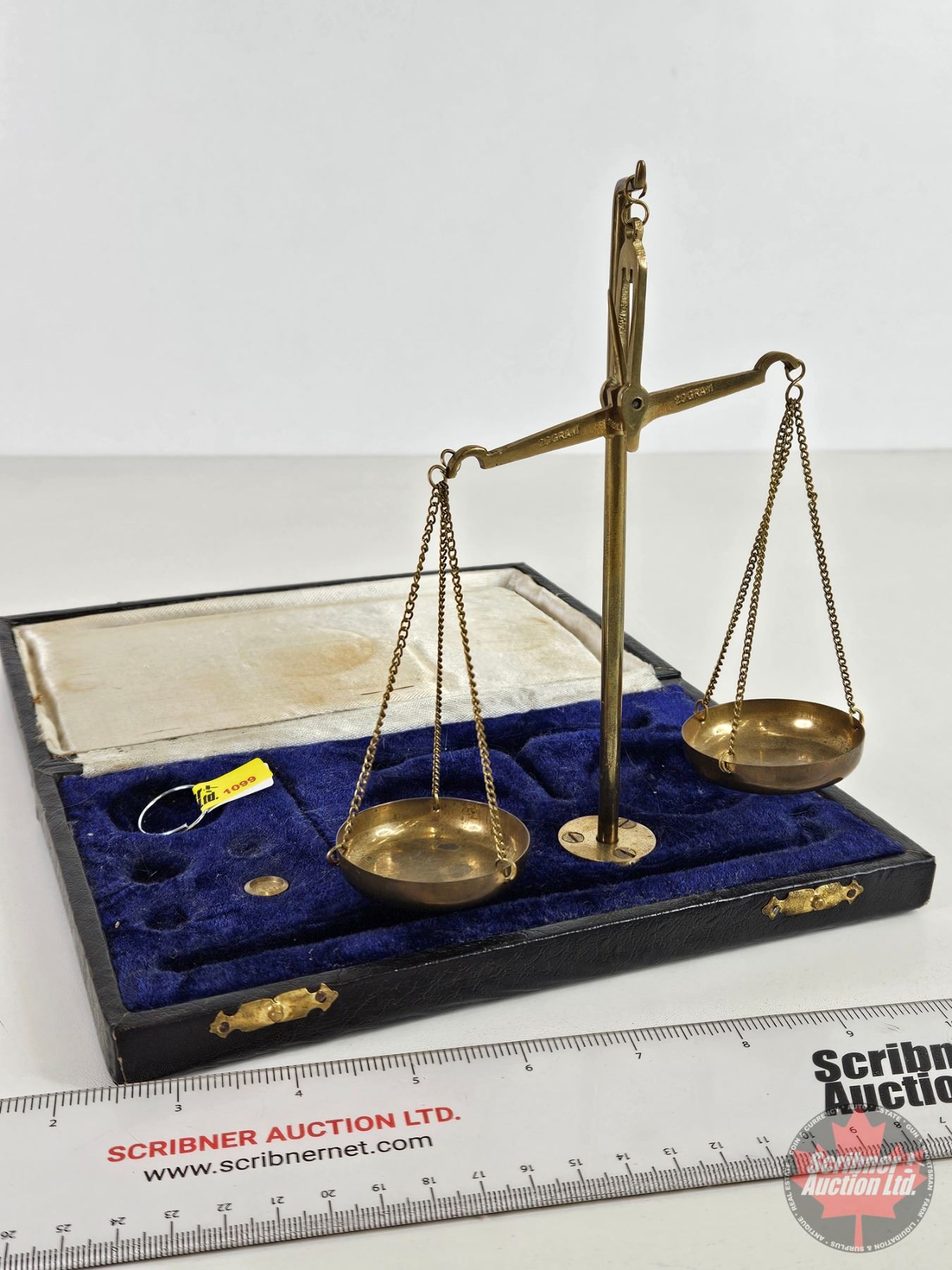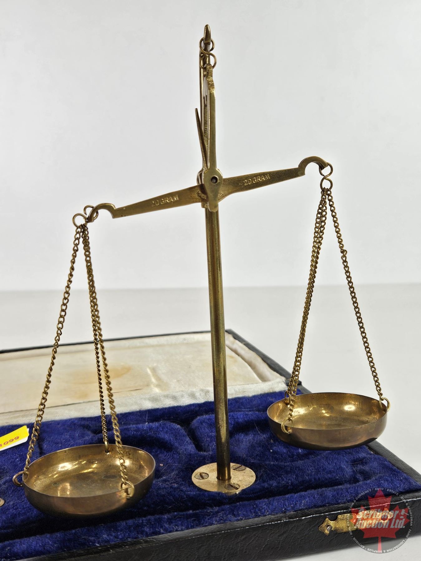 Antique Brass Apothecary / Gold Scale with Case (Note: 3 Weights Missing)