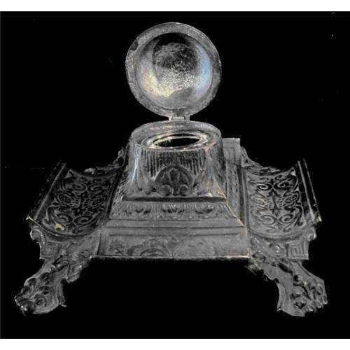 Has original glass insert behind hinged top, which is very rare. The brass is tarnished almost black. Pen holders on all sides. Makes a great graduation gift, or for any occasion. Original glass insert in perfect condition.