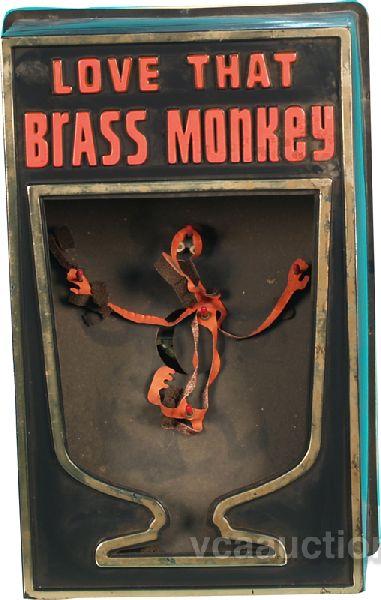 Antique Brass Monkey Whiskey Motorized Display Sign. Black light lit, the rubber man dances in a stage like box. The little rubber man needs to be replaced, all original - 10" x 16" x 5" deep.