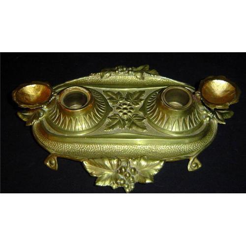 Circa. 1900 Great desk assessory. Footed double ink well and pen tray. Beautifully cast. Wonderful patina. In great condition
