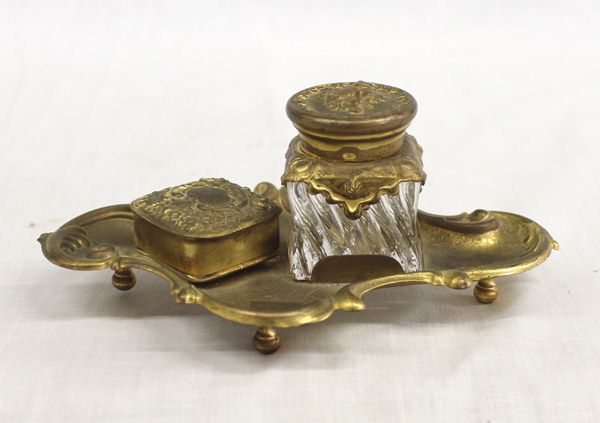 Antique Brass Repousse Ink Well Desk Set, glass ink well bottle, scrolled tray, measures 3'' x 4'' x 6''