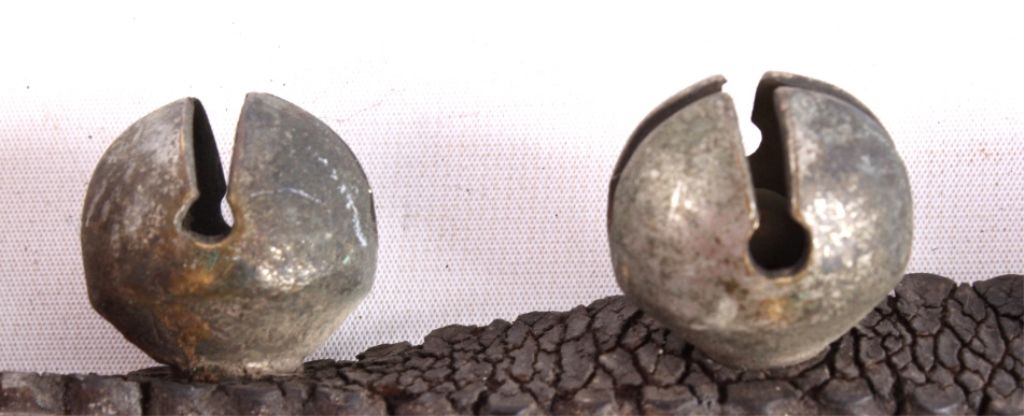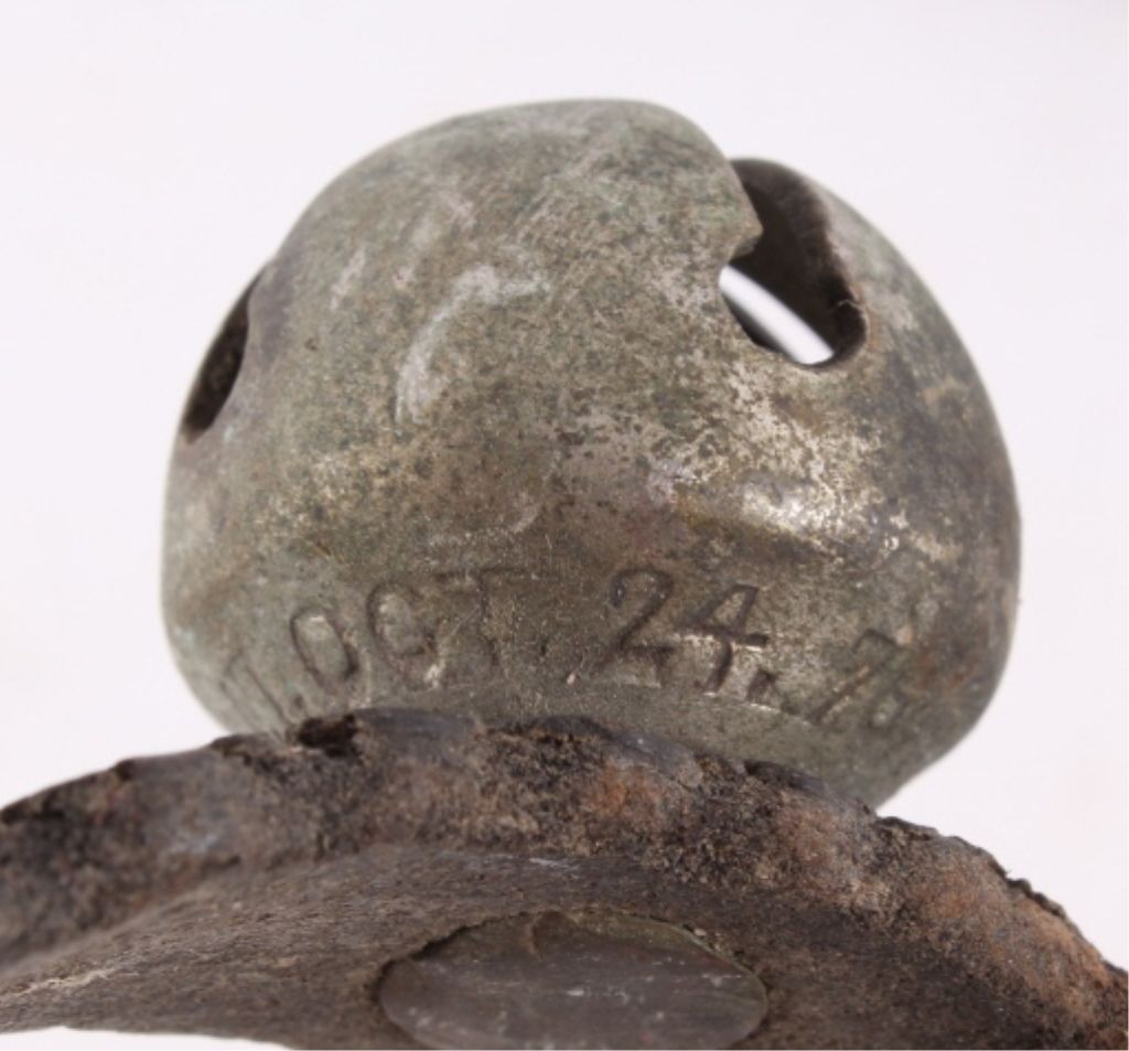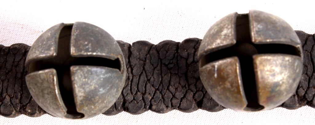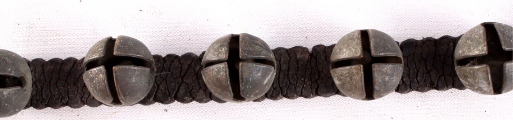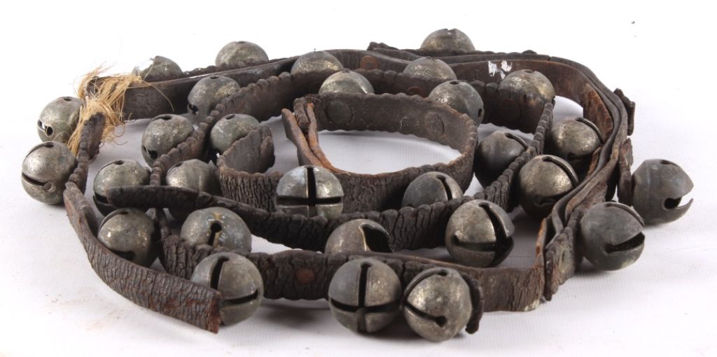 The lot features a set of cast iron and brass leather strung sleigh bells. These have a fantastic look with a vibrant sound. There are 27 1.25"x1.25" sleigh bells with a date of May 1876-1924 around the bottom. The leather shows some wear. Strand is in two parts. Measures 81" long.