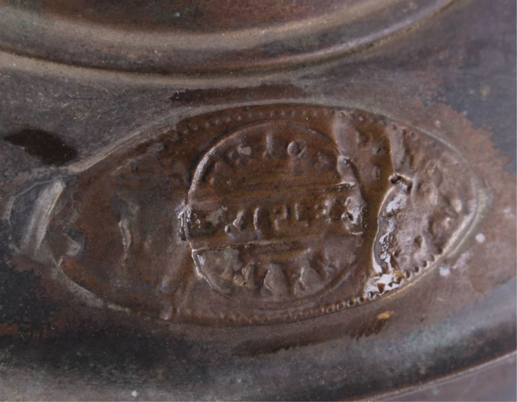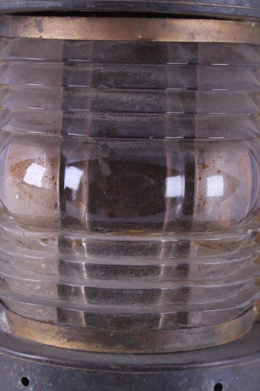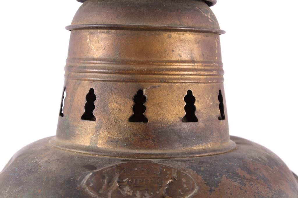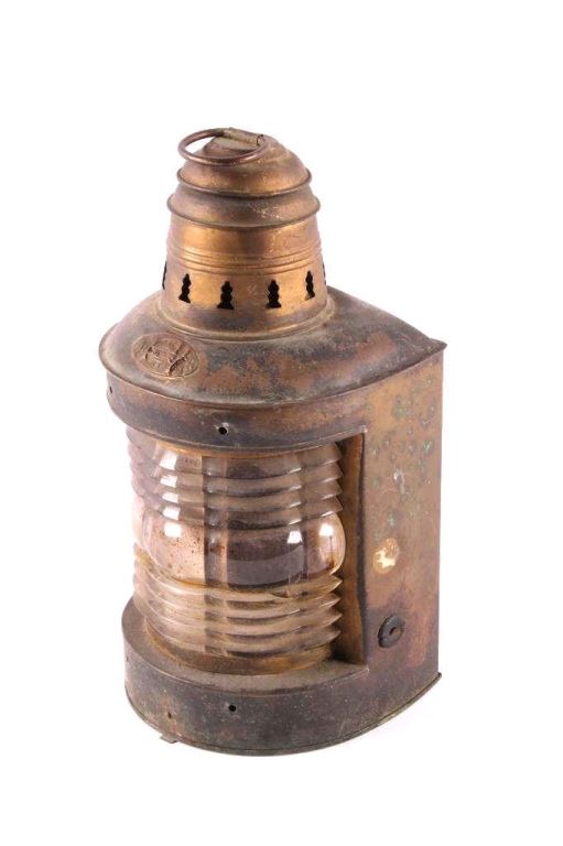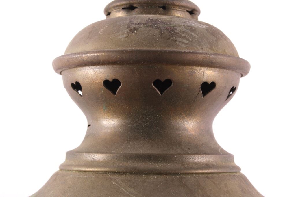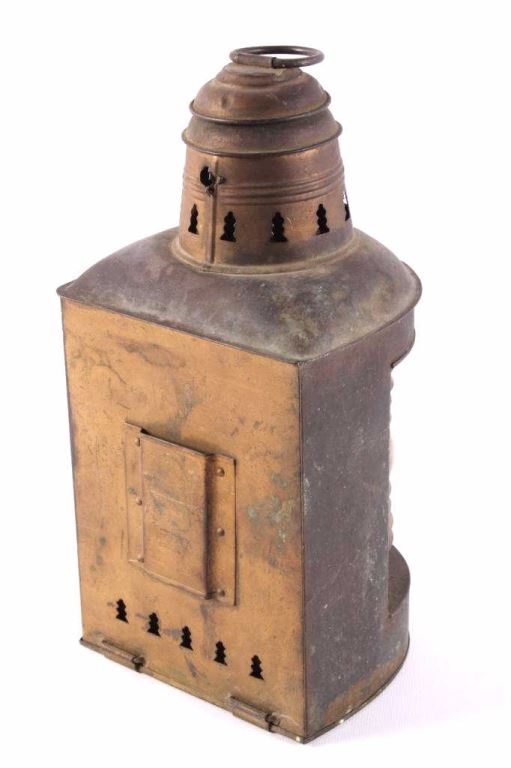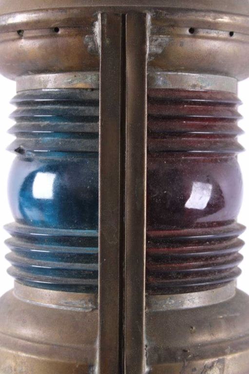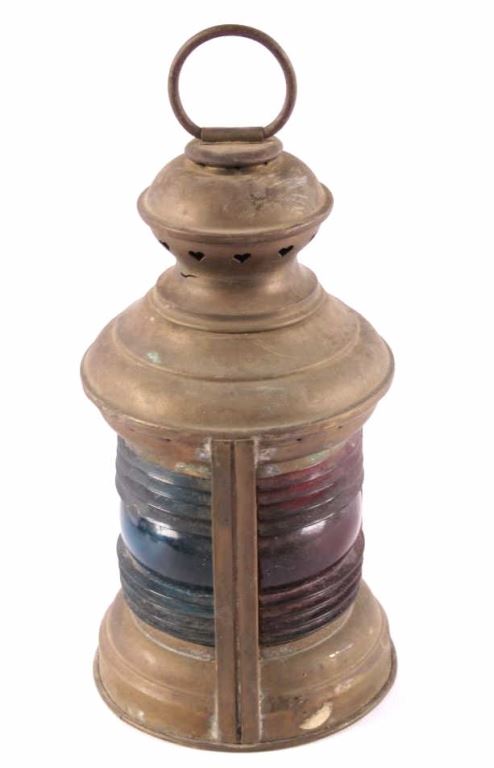 The first is a Triplex brass ships lantern with clear lens and manf. front tag. The other is an early antique brass Bi-Color red and blue ships lantern with unique punched heart motifs across the top. Each shows overall solid condition. Triplex is 13.75"T and 5.5"x6.25". Bi-Color is 10.75"T and 4.75"x5".