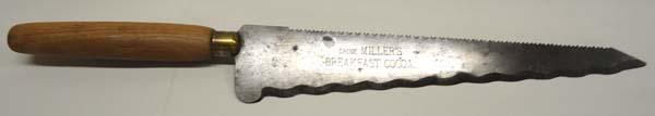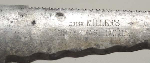 Antique Bread Knife Advertisement, ''Drink Millers Breakfast Cocoa''. Measures approx. 15'' x 2''. Buyers Pay Actual Shipping and Handling Charges(see terms and conditions for more information).