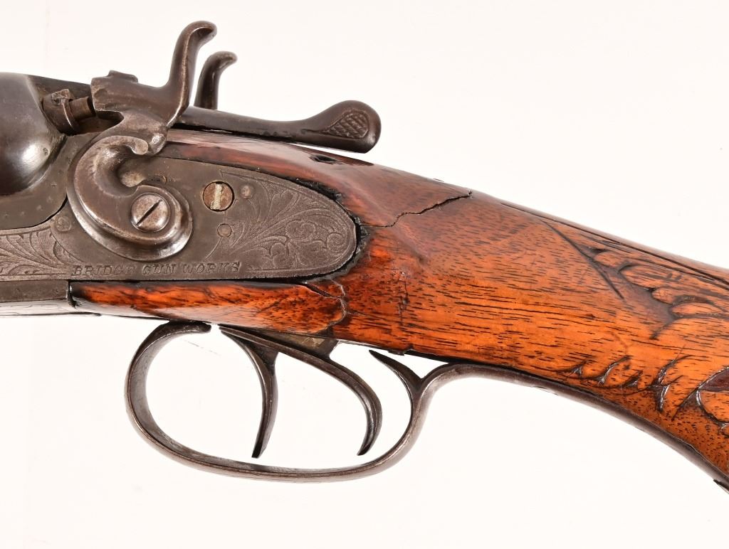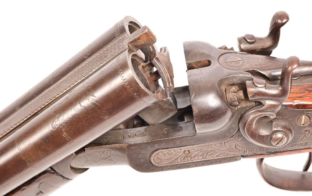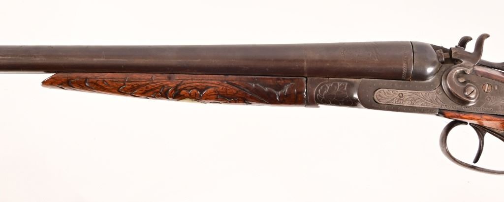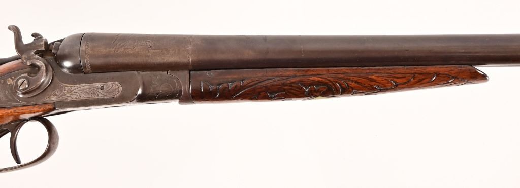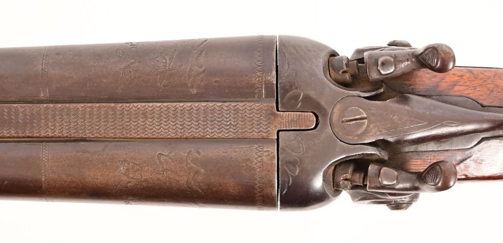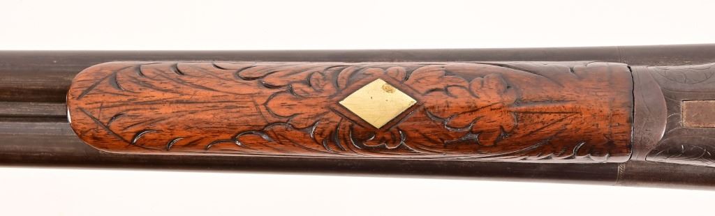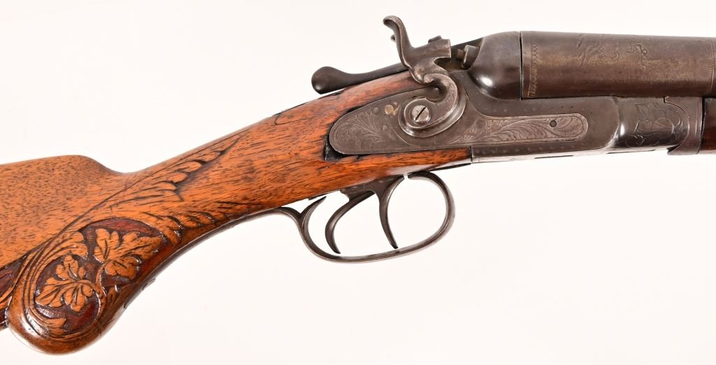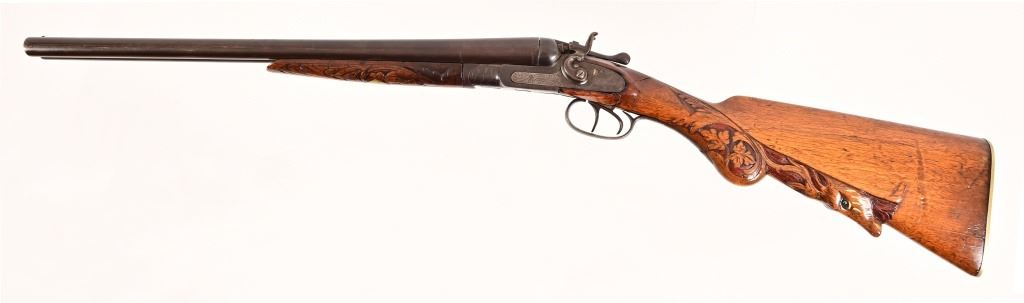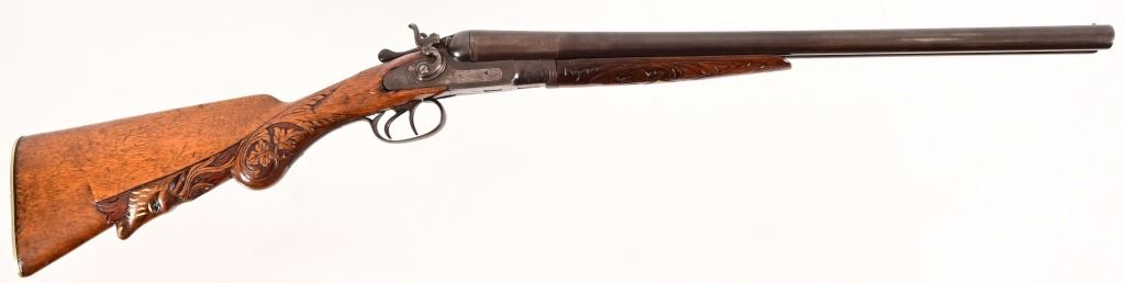 S/N 4845. Made by Bridge Gun Works, Belgium. 20" Damascus barrels, bores are dark. Very ornate carved stocks. Chip repair on left side near receiver. Locks work, action is rather loose. Antique.