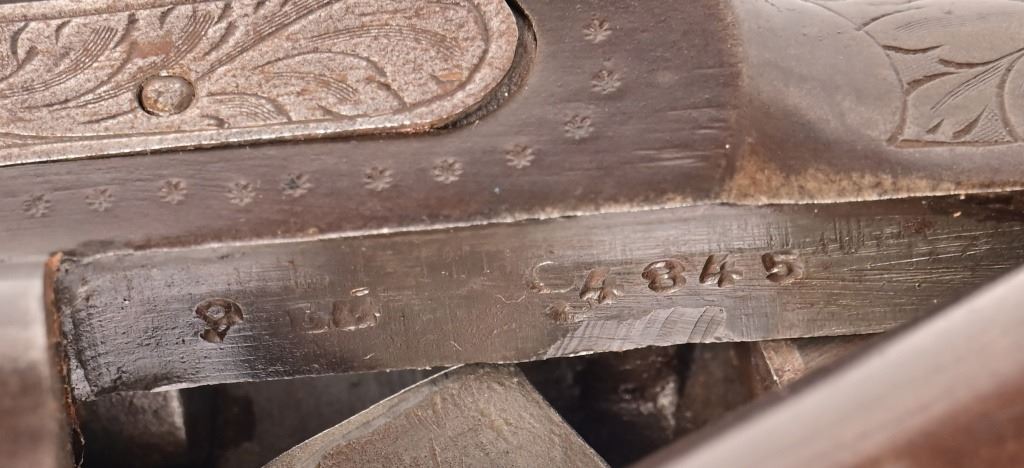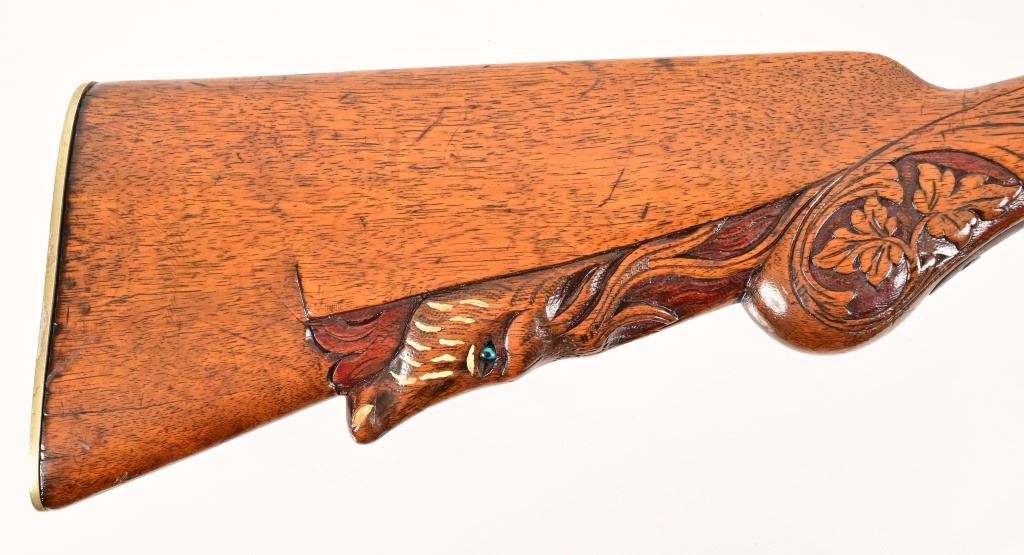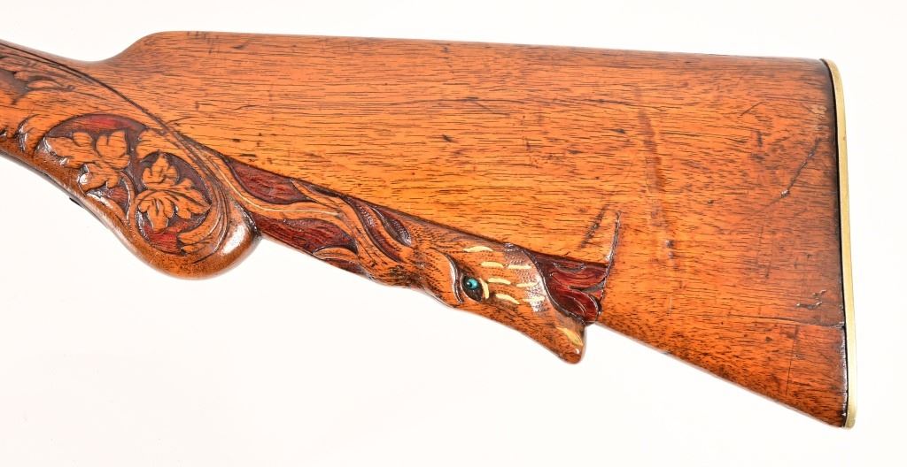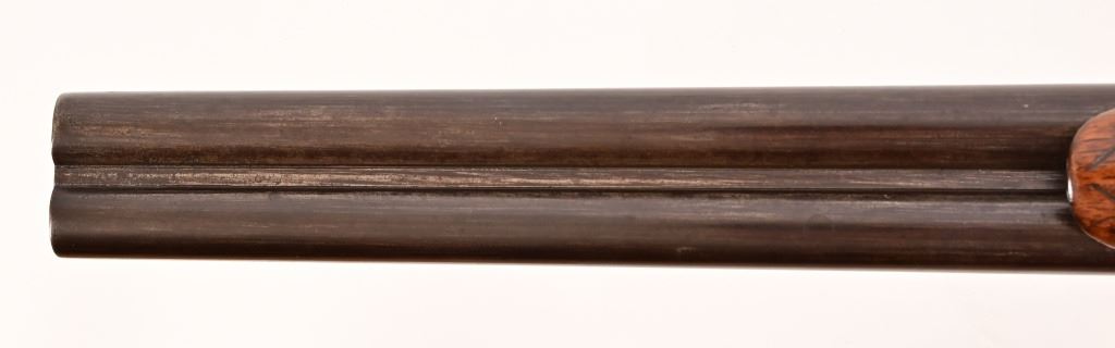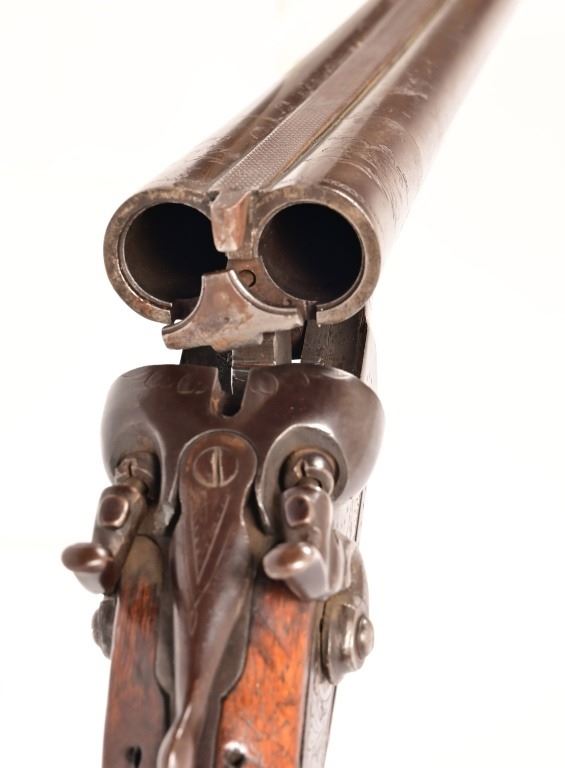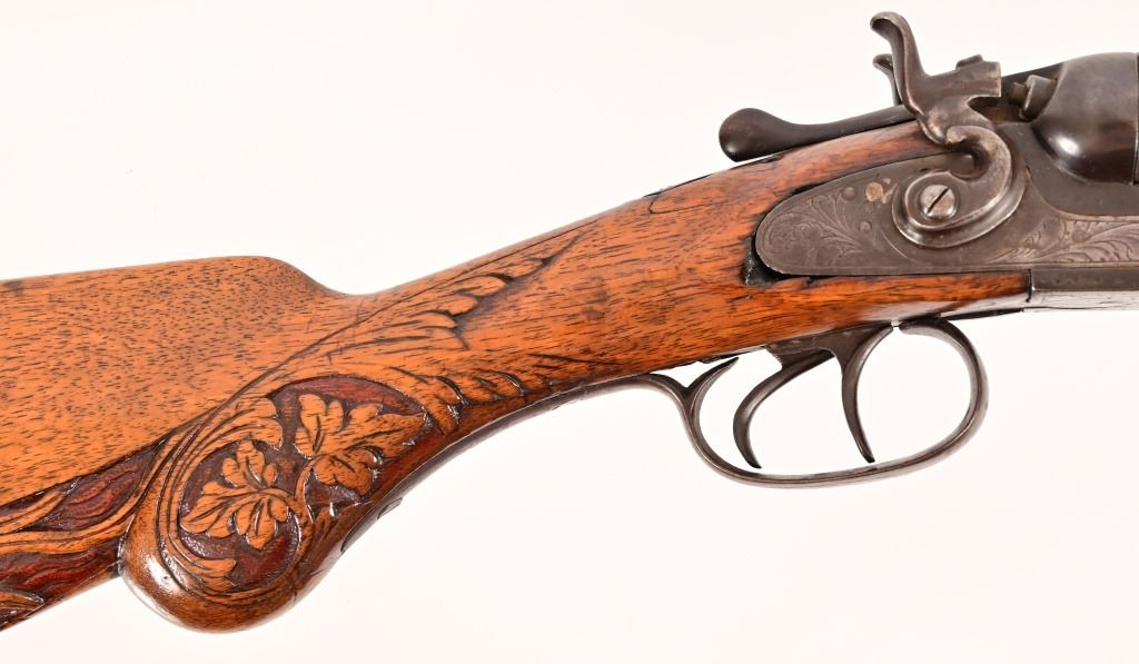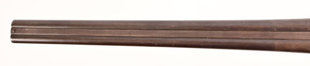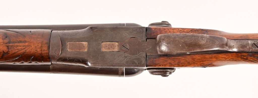 S/N 4845. Made by Bridge Gun Works, Belgium. 20" Damascus barrels, bores are dark. Very ornate carved stocks. Chip repair on left side near receiver. Locks work, action is rather loose. Antique.