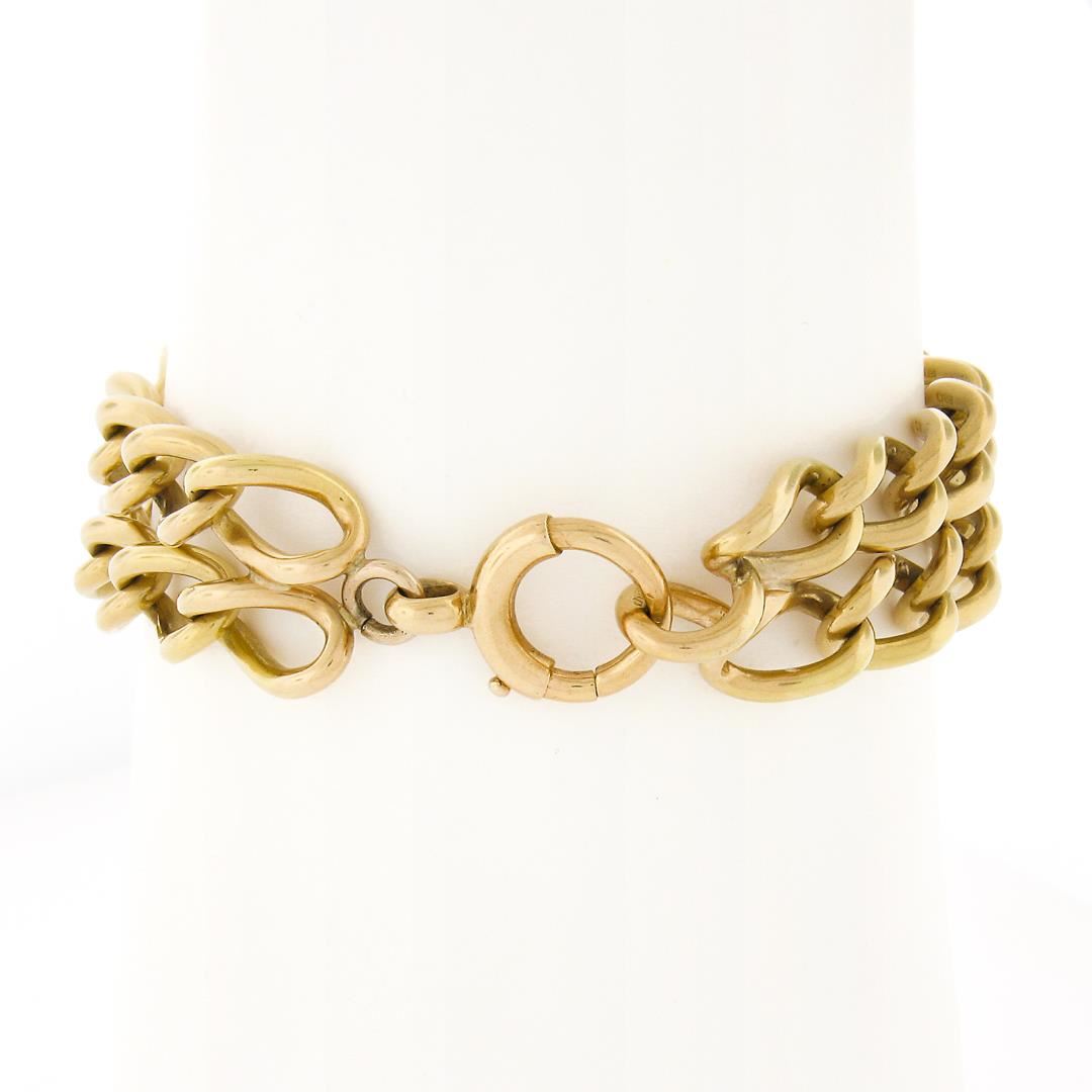 An antique solid 18k yellow gold curb link bracelet. It weighs a total of 51.68 grams, measures 15.5mm wide, and measures 6.5 inches in length.