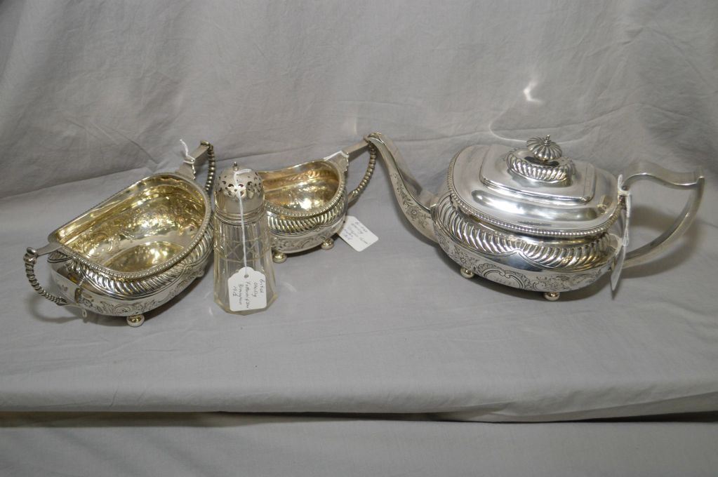 Antique British sterling tea service including teapot made by Crispin Fuller, London dated 1814 and matching cream and open sugar also Crispin Fuller, London dated 1815 and a British sterling sugar castor by Fattorini and Sons Ltd., Birmingham 1915