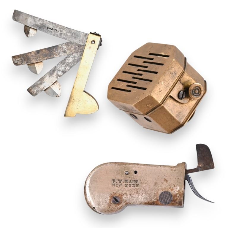 Three antique bloodletting devices. Marked for P.W. Bain, New York, Lanceets marked BORWICK, brass scarificator unmarked.