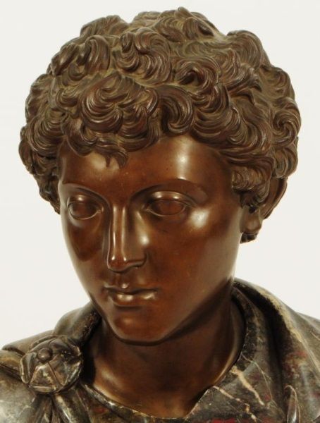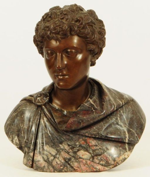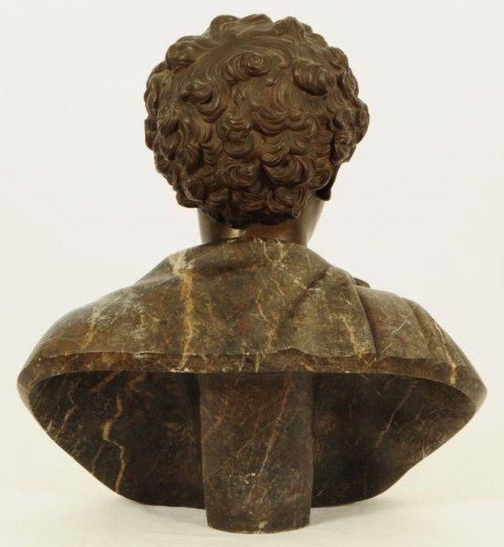 Head is bronze, unattached from base. Base (shoulders) is marble. 20" wide x 10" deep x 22" tall.