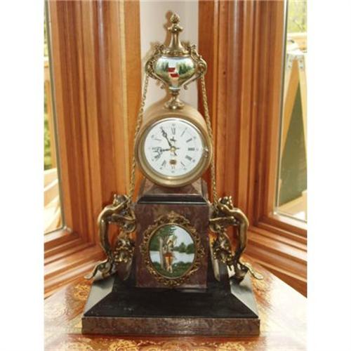 This is an early 20th century cast bronze and marble shelf clock. It has hand painted porcelain medallion and finial. There are two great bronze winged mermaids (angels) on either side of the clock. The beveled glass does have a sliver chip on the inside and the back plate is missing. The face of the clock says "Knight" and has a silhouette of one. The clock has a key, but does not work. Not sure what is wrong or what the cost to fix it would be. 16.5 INCHES HIGH 9.75 INCHES WIDE AND 5.5INCHES WIDE. WEIGHS 13+ POUNDS UNPACKED.