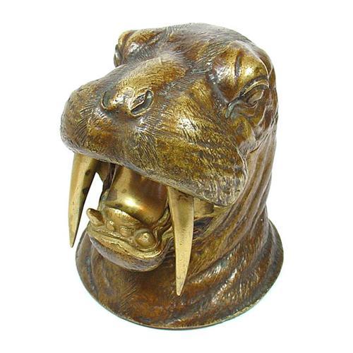 Bronze walrus head inkwell. Realistically detailed with open mouth displaying two saber-like tusks, a tongue, and four teeth. The upper jaw is hinged at the back of the head and opens to reveal the inkwell. A lipped glass insert fits inside.