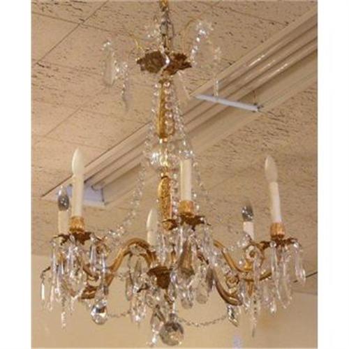 This is an exquisite antique gilt bronze and crystal chandelier with six candlestick lights. It is wired for USA use and ready to be hung. This graceful chandelier makes an elegant addition in the finest interior!