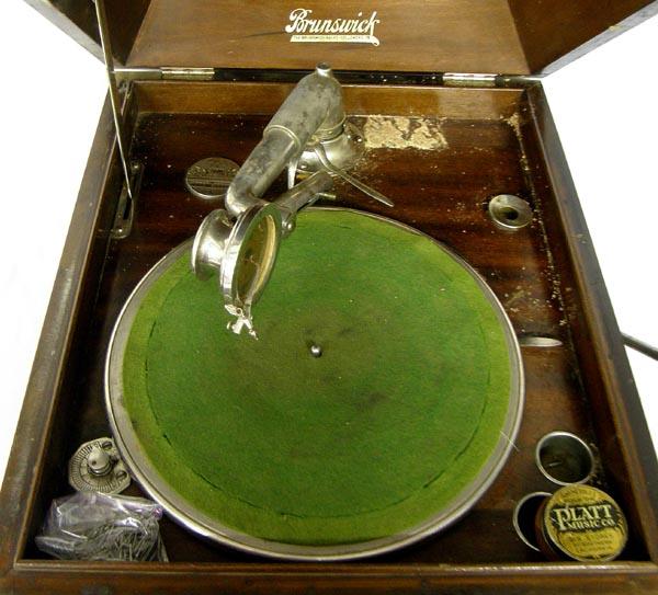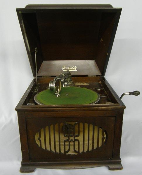 Antique Brunswick Victrola by Brunswick-Blake-Collender Co. Wood cabinet is in good condition for age, the turntable does run, comes with a tin of replacement needles. Measures approx. 15.5''Hx20''Lx17''W. Buyers Pay Actual Shipping and Handling Charges(see terms and conditions for more information).