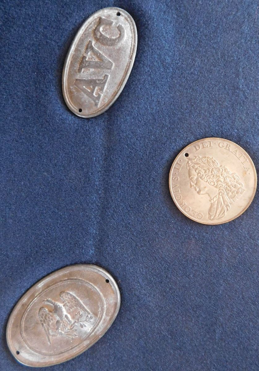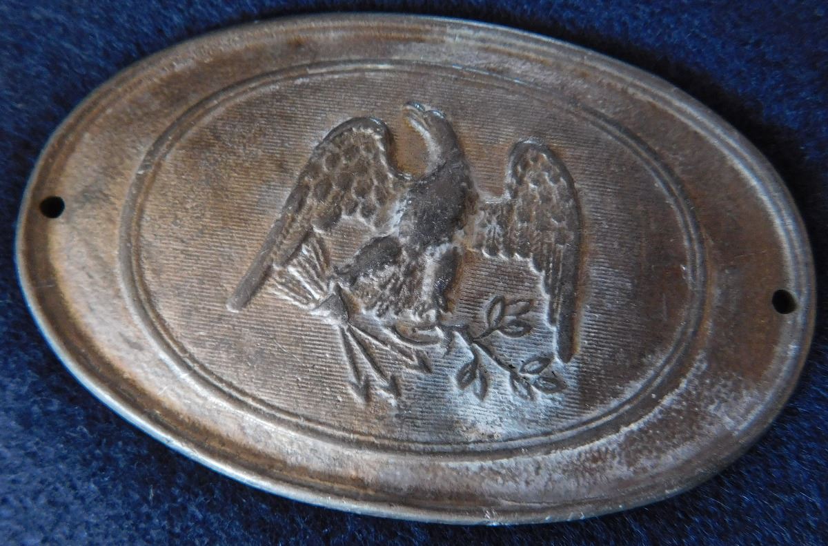 Antique Buckle Collection, circa 1860s. Made of brass, pewter and nickel silver, the buckle measures 3 1/8". Early American. Peace medal in lot. Frame not included. Condition: Some wear and patina, see images. Shipping: $22.50
