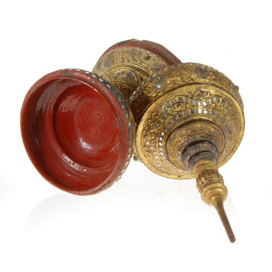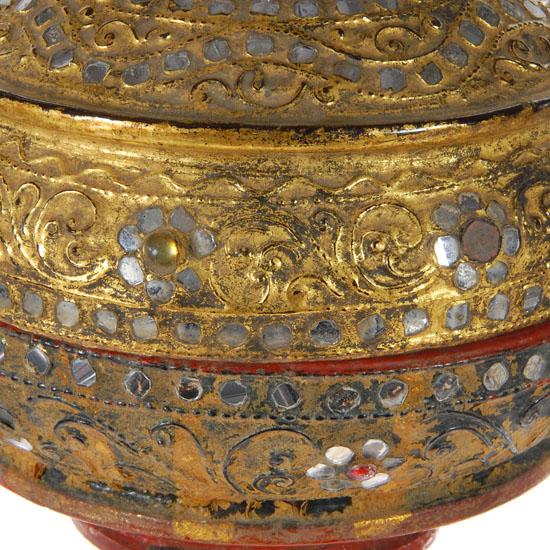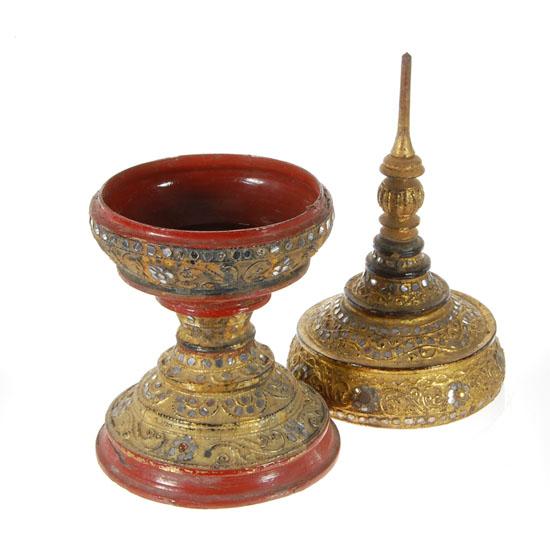 With Lid; Gilded; w/ Mirror Ornaments on Laquerware; Used to place offerings are main temple Buddha; Early 1900s; 17"