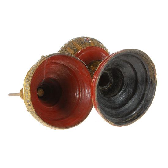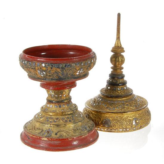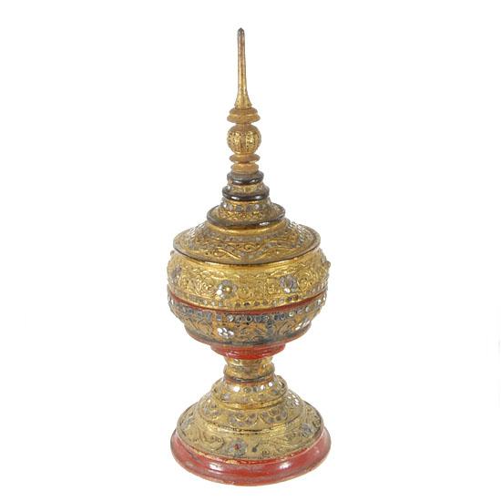 With Lid; Gilded; w/ Mirror Ornaments on Laquerware; Used to place offerings are main temple Buddha; Early 1900s; 17"