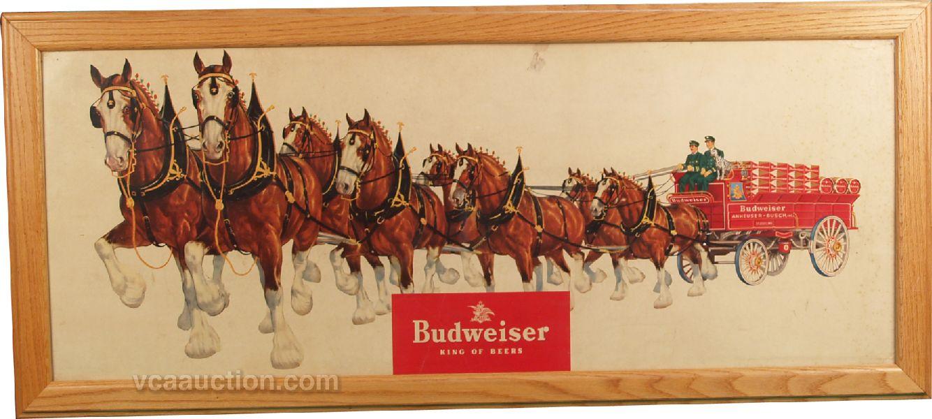 Antique Budweiser Beer Cardboard Sign, w/ wagon & clydesdales in wood frame - 54" x 24"