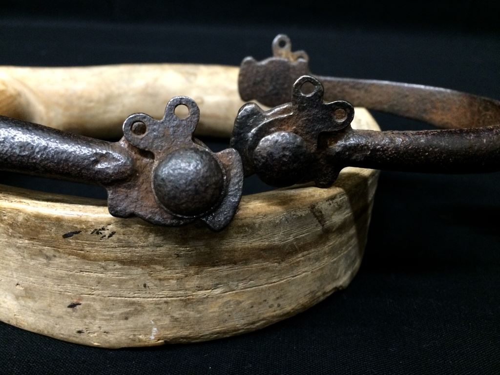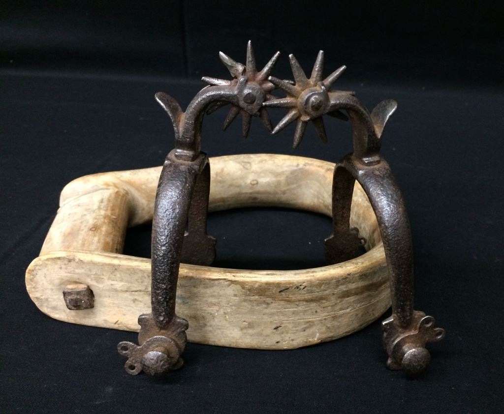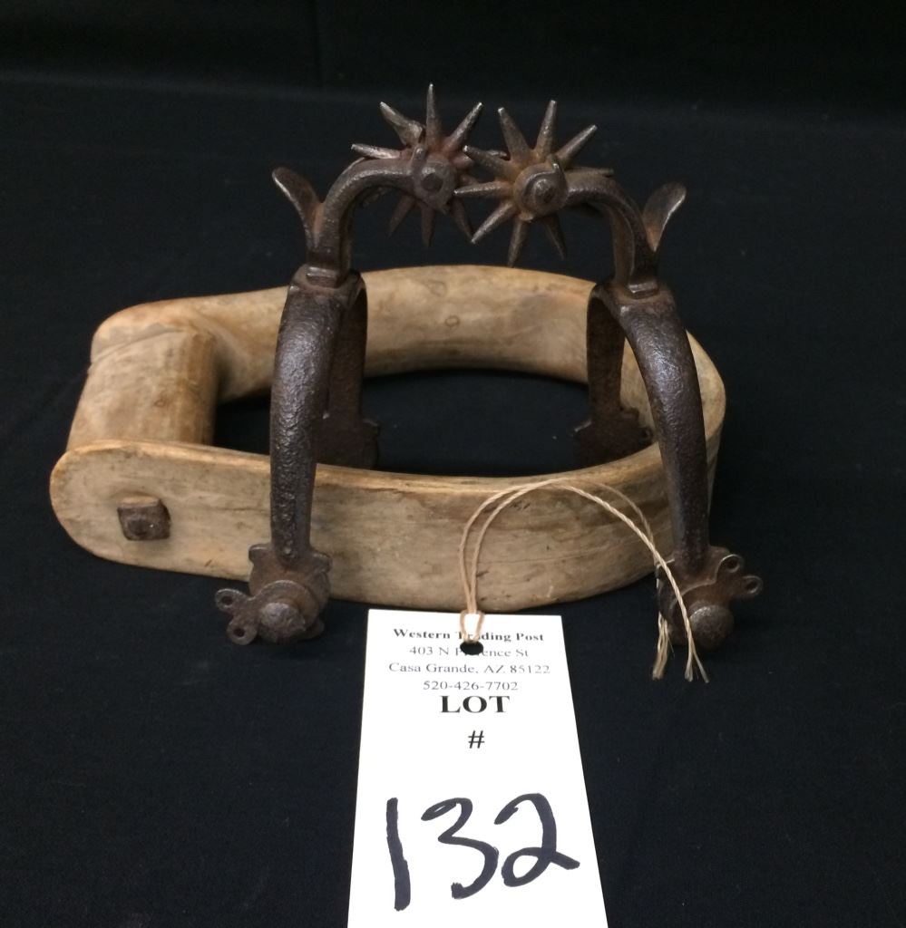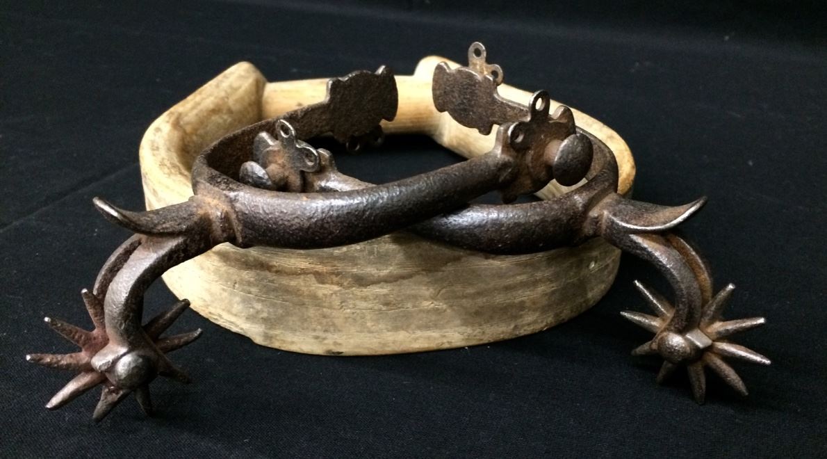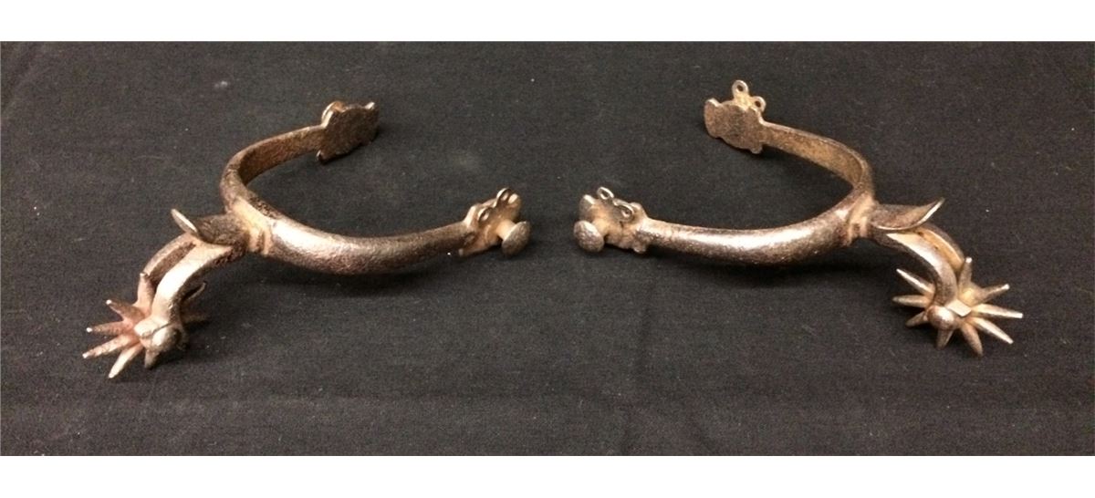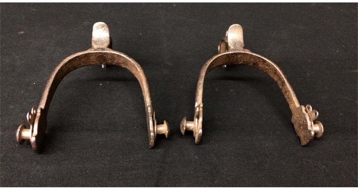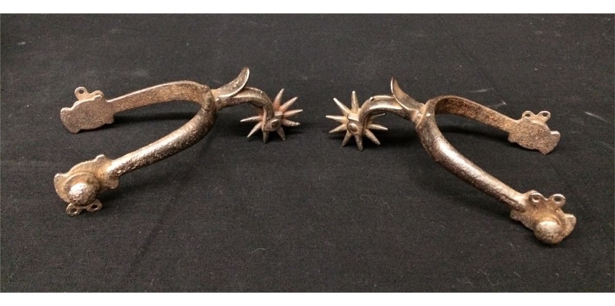 These antique spurs have a faint “Star” mark which was used by August Buermann. These are early spurs, probably late 1800s. Measure just under 3” at the opening and have a .5” wide heel band. Drop shanks are just over 2” with rowels. There has been a repair to one of the rowels and the heel chain hangers are rusted in place. Could probably be freed up with a little work. Shipping: There will be a $5 handling / packaging fee for shipping this lot. The actual cost of postage will be added on top of that.