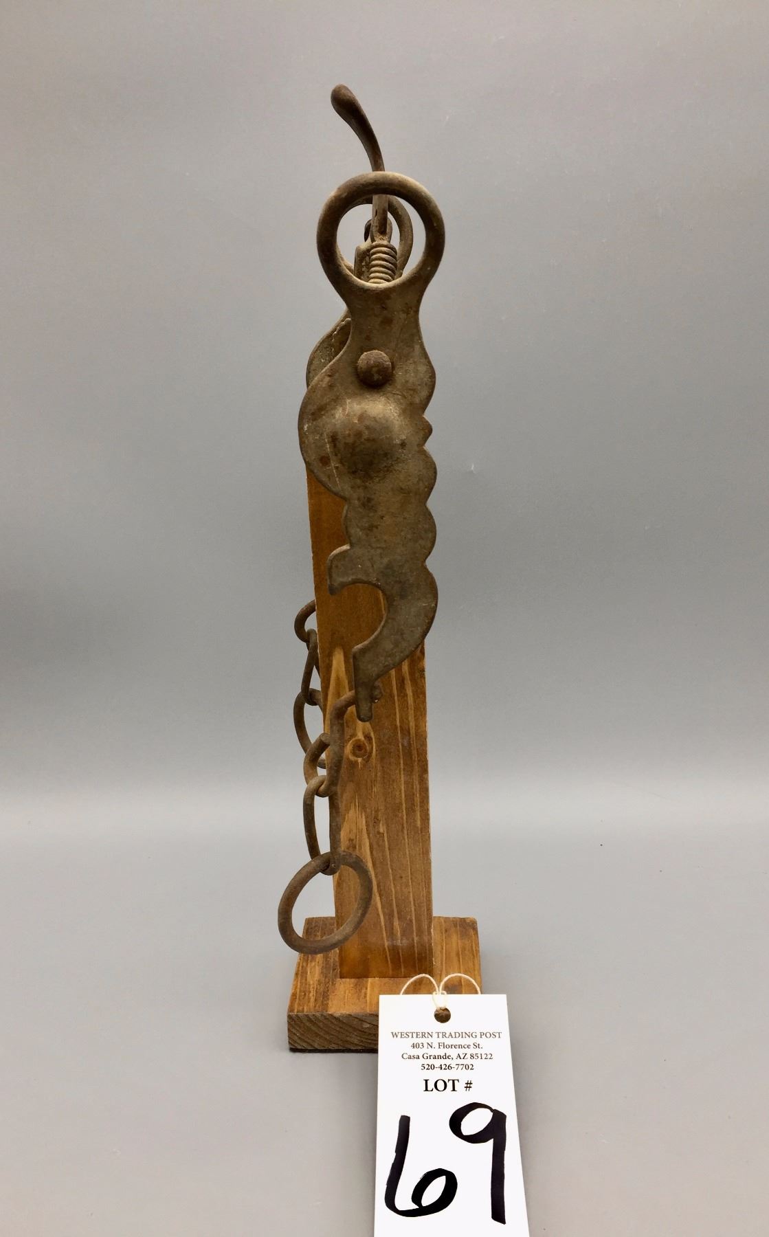 Description: An antique horse bit with a spade mouth and bird designs on the shanks. Maker: No hallmark was found, but an older Buermann style bit. Approx. Age: Circa early 1900s. Size: Shank 6-1/4” Mouth 4-3/4”. Condition: Good for its age, normal wear expected and looks to have been painted silver at some point. Please look closely at the pictures - they are an important part of our description. Shipping: There will be a $5 handling / packaging fee for shipping this lot. The actual cost of postage will be added on top of that.