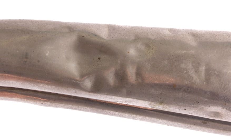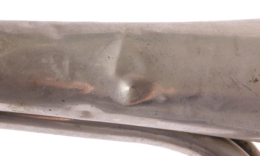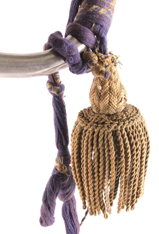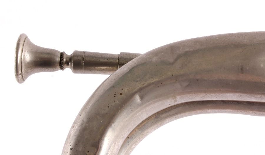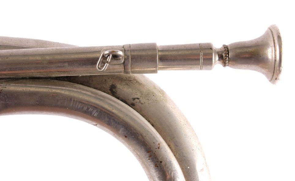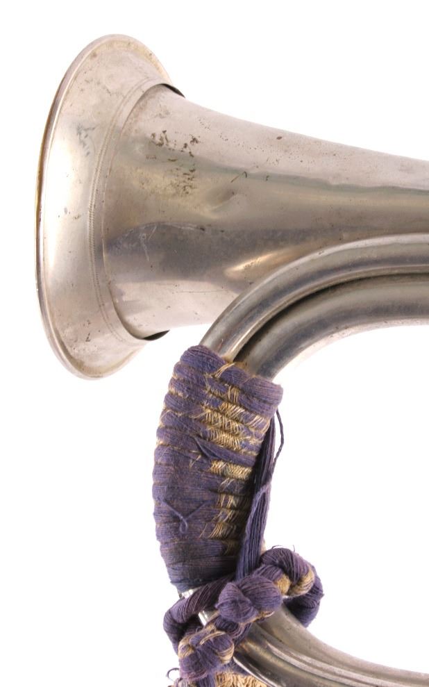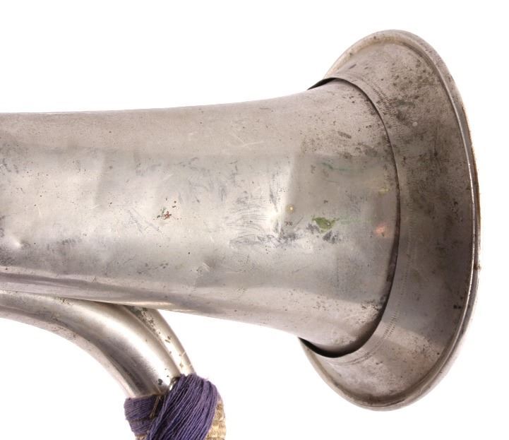 This is an antique silver plated brass bugle with tassels. The bugle is not marked and shows fair condition with several dents as shown. The bugle measures 7.5" x 14".