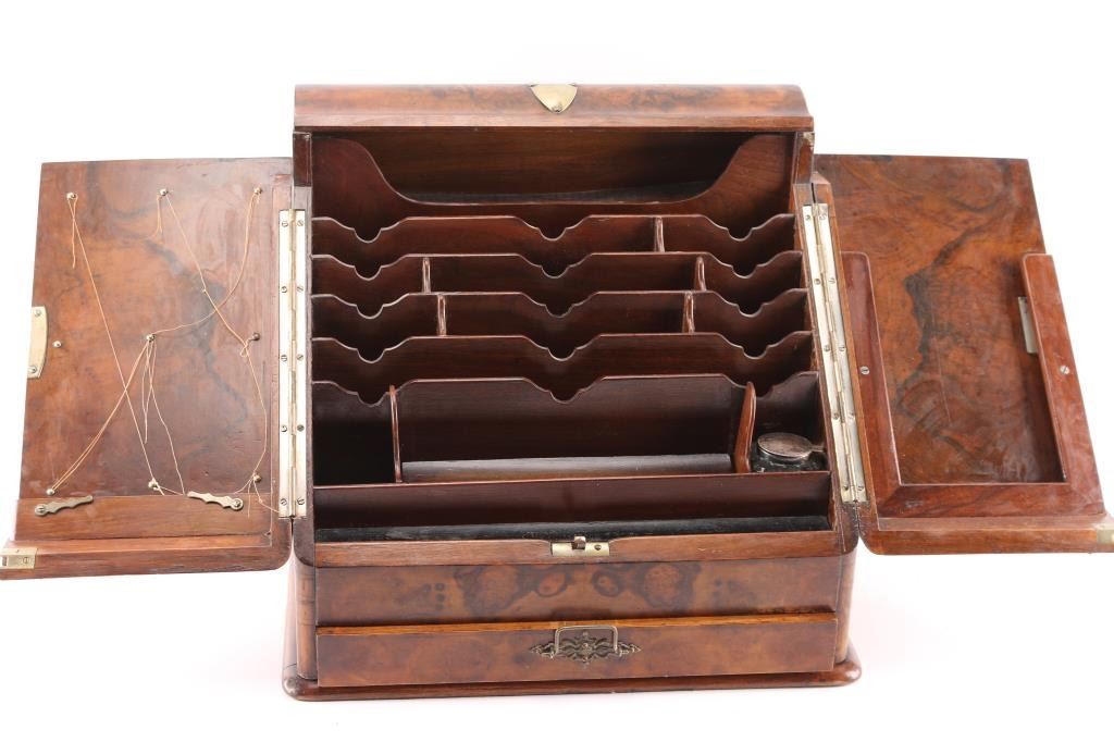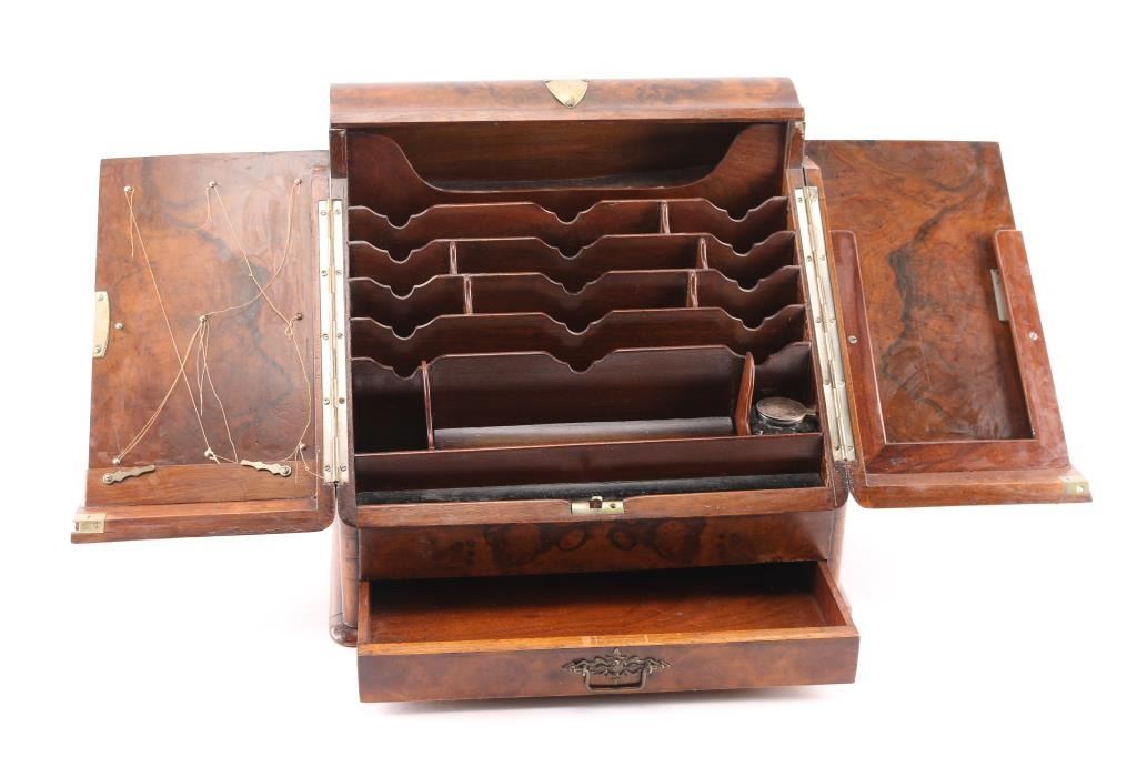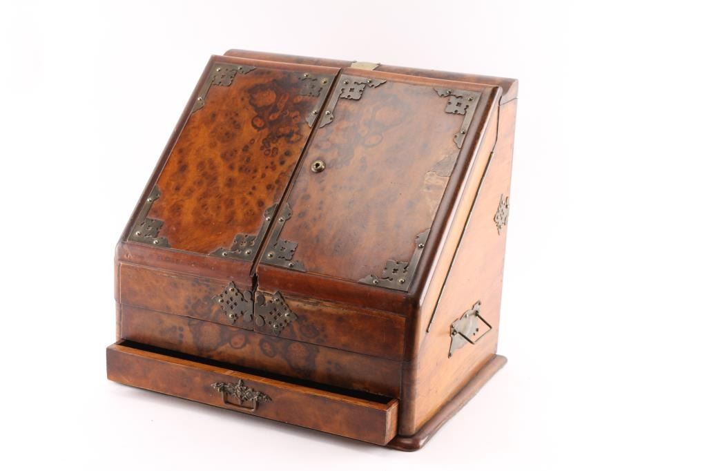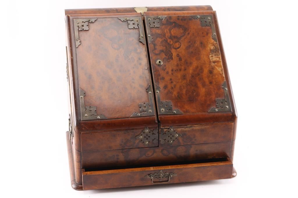 Portable desk with file top and drawers that is constructed of exotic burled hardwood with veneered panels. Brass pierced decoration and fancy pull. Locking front shutters. Silver topped glass ink bottle. 15"H x 12"W. Great quality and good condition. Mid to 2nd quarter 19th century Continental MFG. Probably Italian or French made.
