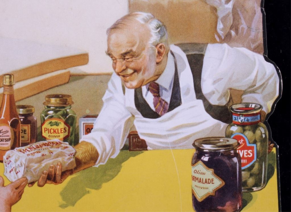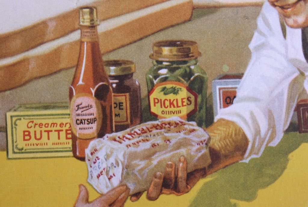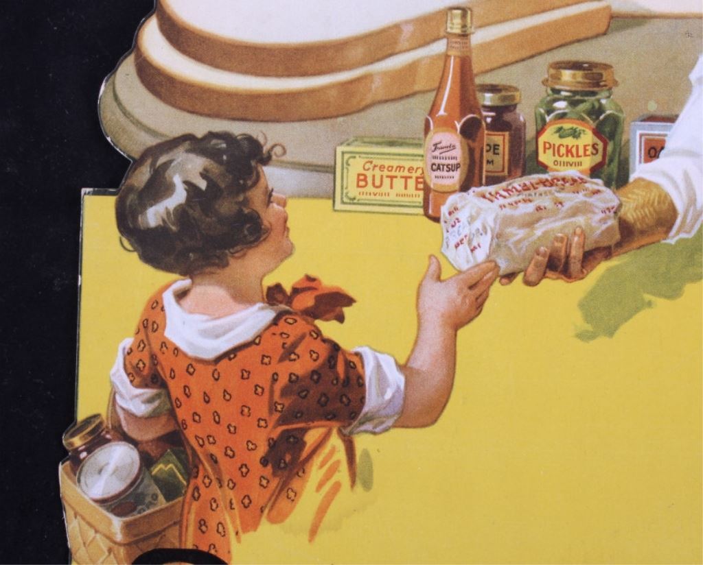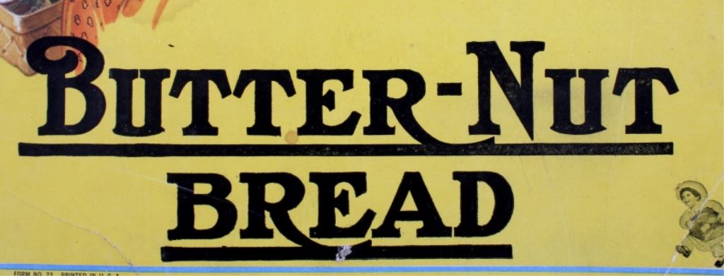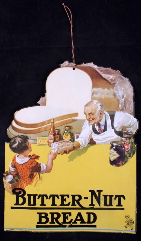 This is an original Butter-Nut Bread advertisement. This is a cardboard piece that would have been used in a grocery store. This piece shows good condition with little to no fading of the colors. There are a couple folds and slight damage as pictured. The cardboard advertisement measures 10.25" x 13.5".