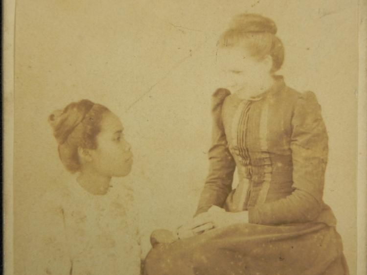 This antique Carte de Visite photograph is a studio shot of young African American Woman sitting beside an older Caucasian woman. Their relationship may have been one of servant, housekeeper, or caretaker, and employer. The note on the reverse side may indicate the photograph was given to the young woman as a gift. The message is hand written in ink: Compliments Mrs. F.D Phi__ (name illegible). The size of the photo is standard, 2 1/2 x 4 inches. Its condition is very good, with clear image, slightly faded and overexposed, in sepia tone. It appears to be a very early image. * * This is a fine and lovely original photo for anyone interested in Black Americana.