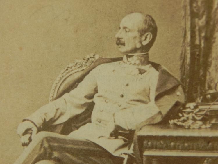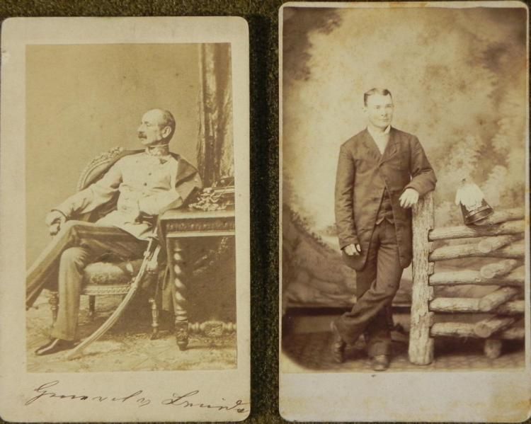 Here are two antique military themed Carte de Visite photographs. One is of a WWI Prussian officer and the other a WWI high ranking German military officer. The size of the photos is standard, 2 1/2 x 4 inches. They are both in very good condition, with clear image, and some surface wear. On the bottom of the German military officer photo is his name which is difficult to make out. On the reverse side of the Prussian officer is the name of the stuido, Grossklaus of Ricksecker, Navarre, Ohio. * * *