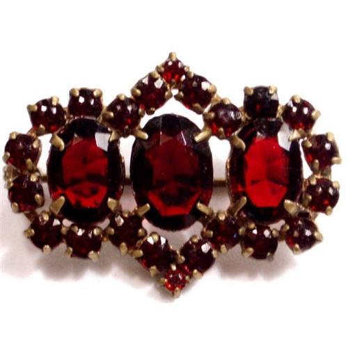 This is one of the prettiest GARNET brooches ( signed Czechoslovakia) that I have seen. This is 1 1/2" x 1" with three large center stones. They are all prong set too. IN very good condition this is an amazing old piece.