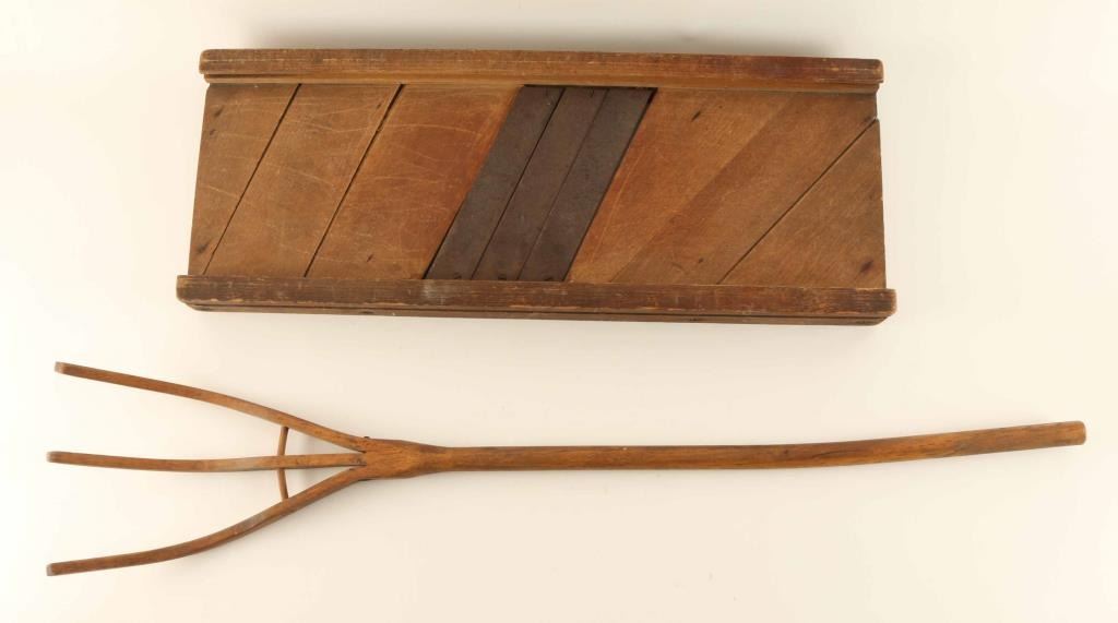 (1) Antique Large Wooden Indianapolis kraut cutter/cabbage slicer 1870-1900 with Slide, without box, measures approx 24" long X 9" wide (1) Antique pitchfork measures 34" long X 7" at widest part of fork