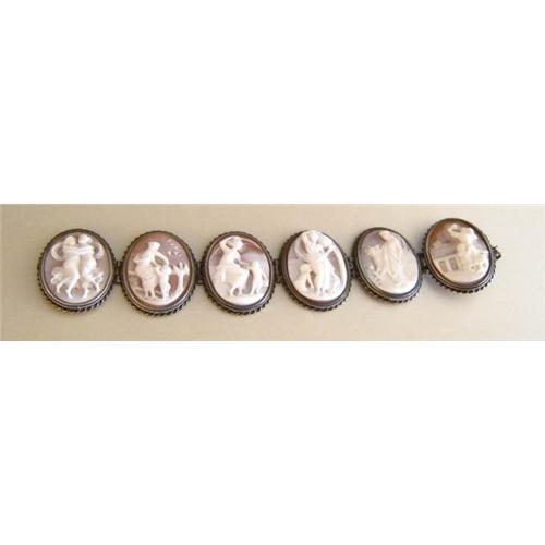 Italian. Absolutely beautiful cameos. Six shell hand-carved cameos set in silver frames. Invisible clasp. In excellent original condition